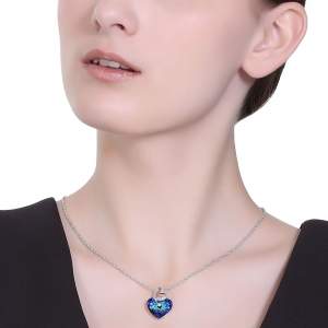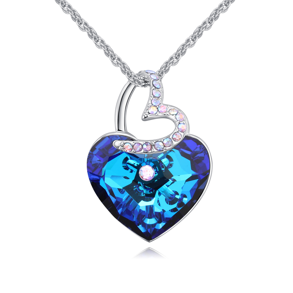 Collar en baño de oro blanco de 18 quilates, diseño con corazón de cristal azul y corazón plateado e incrustraciones de cristales blancos. Fabricado en una estructura de aleación de platino con rodio sin níquel.