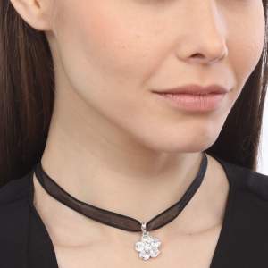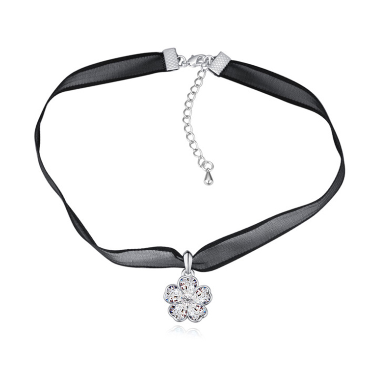 Gargantilla de listón negro con dije en baño de oro blanco de 18 quilates, hermoso diseño de flor con incrustración de cristales en color blanco. Fabricado en una estructura de aleación de platino con rodio sin níquel.