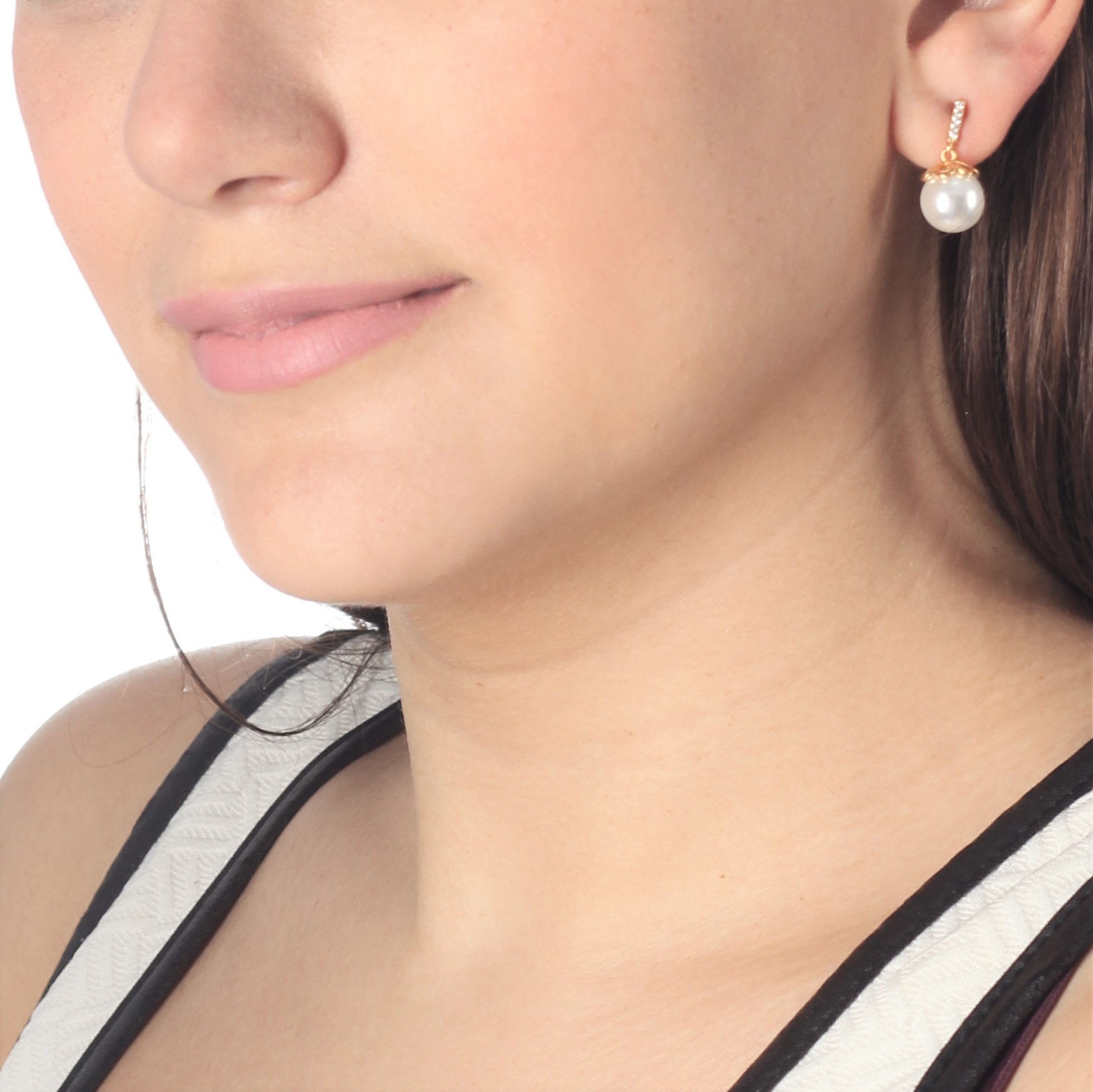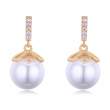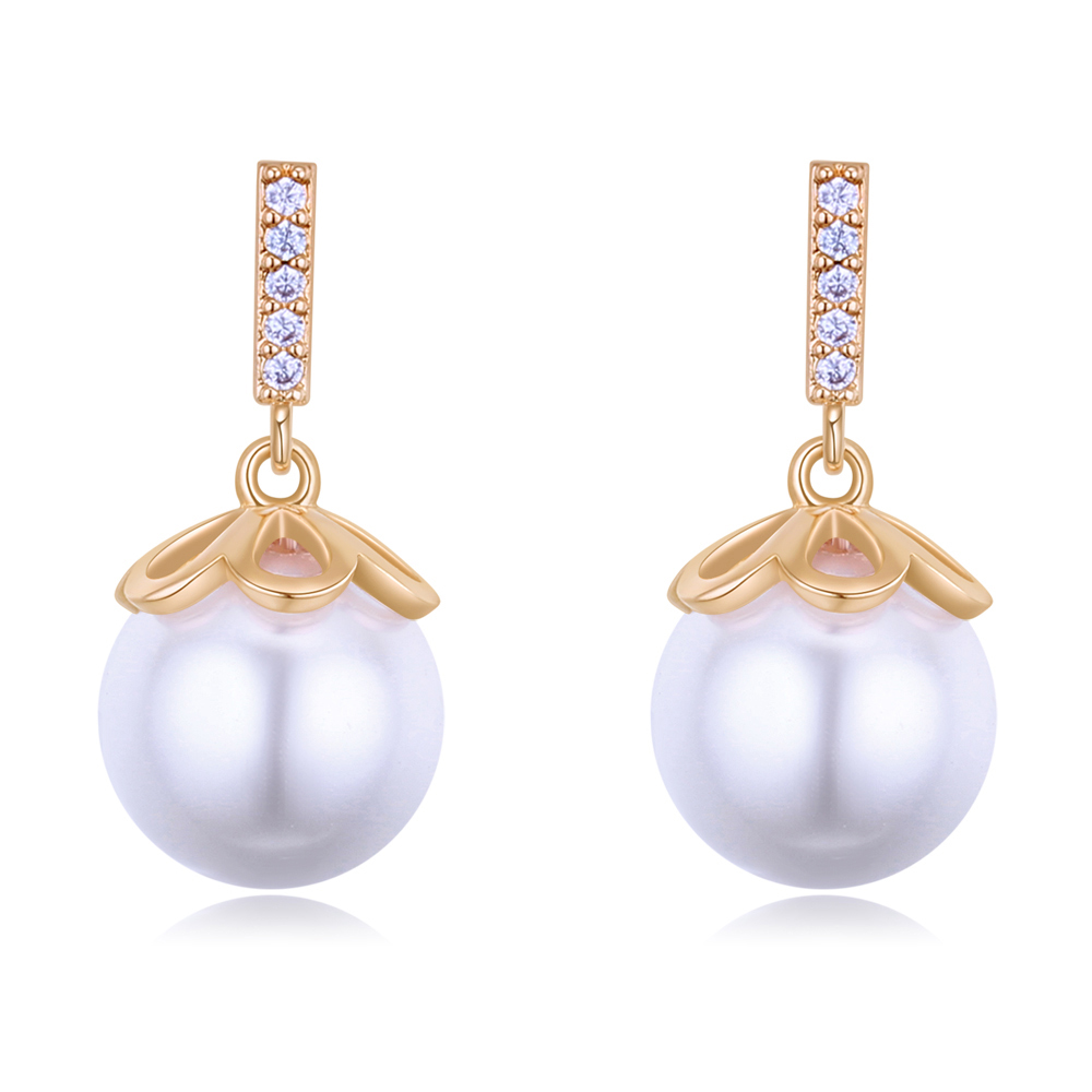 Aretes en baño de oro amarillo de 18 quilates, diseño con perlas e incrustación de cristales en color blanco. Fabricado en una estructura de aleación de platino con rodio sin níquel.