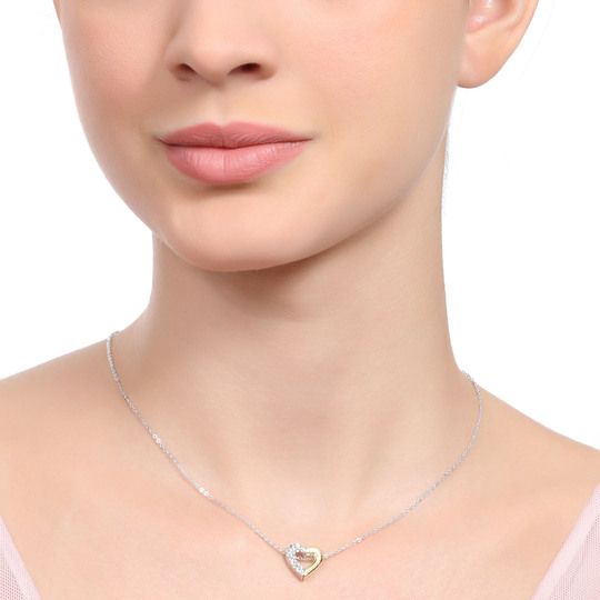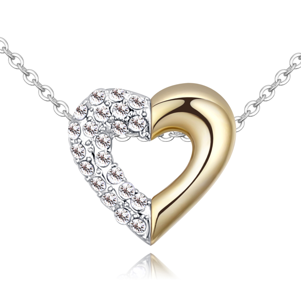 Dije con cadena en baño de oro blanco y amarillo de 18 quilates, diseño de corazón,mital dorado brillante, mitad plateado con incrustaciones de cristales en color blanco. Fabricado en una estructura de aleación de platino con rodio sin níquel.