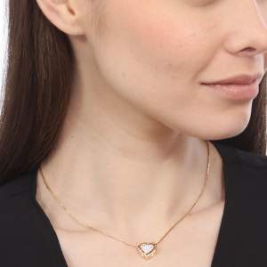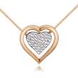 Dije con cadena en baño de oro amarillo y blanco de 18 quilates, diseño de un corazón dentro de otro, con incrustaciones de cristales en color blanco. Fabricado en una estructura de aleación de platino con rodio sin níquel.
