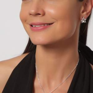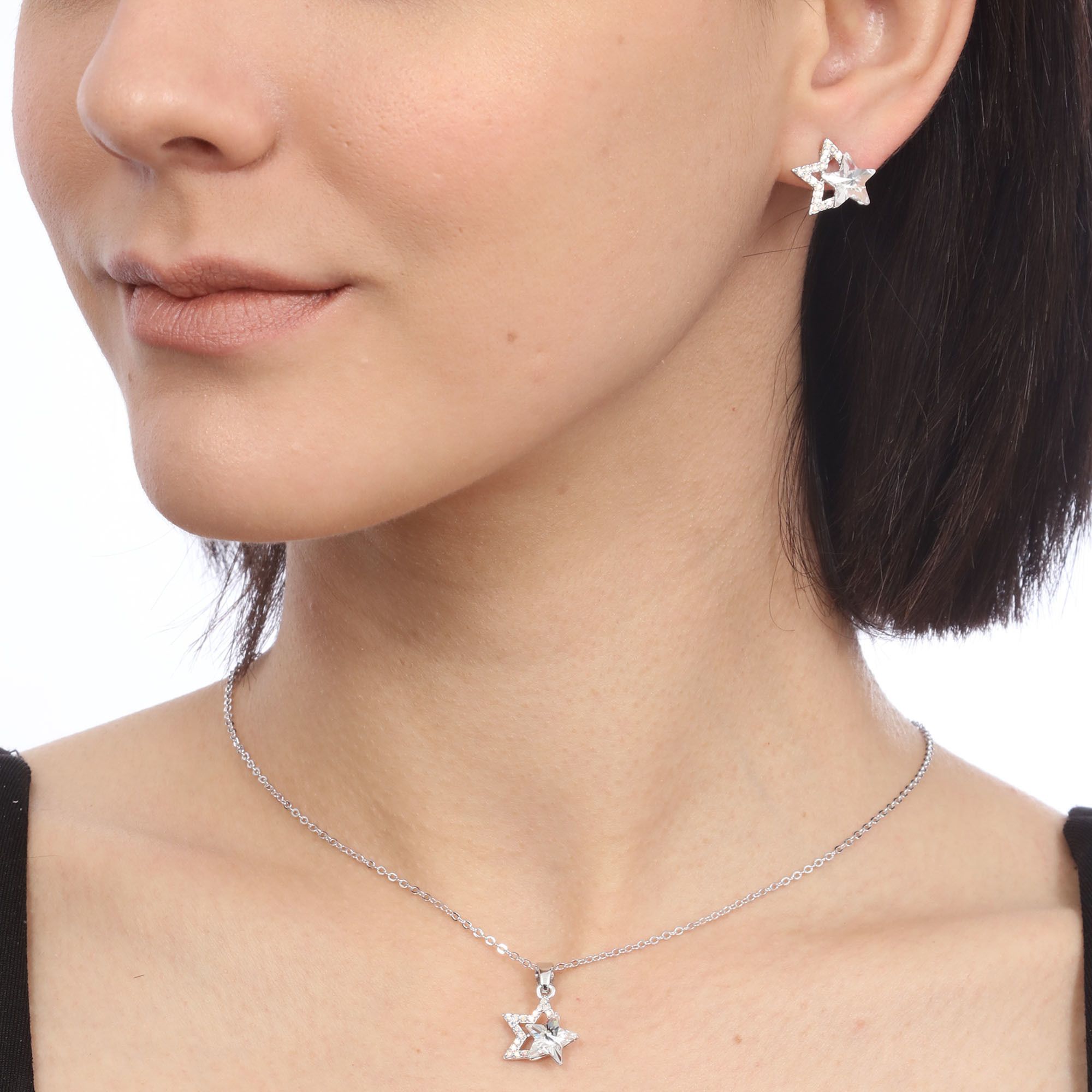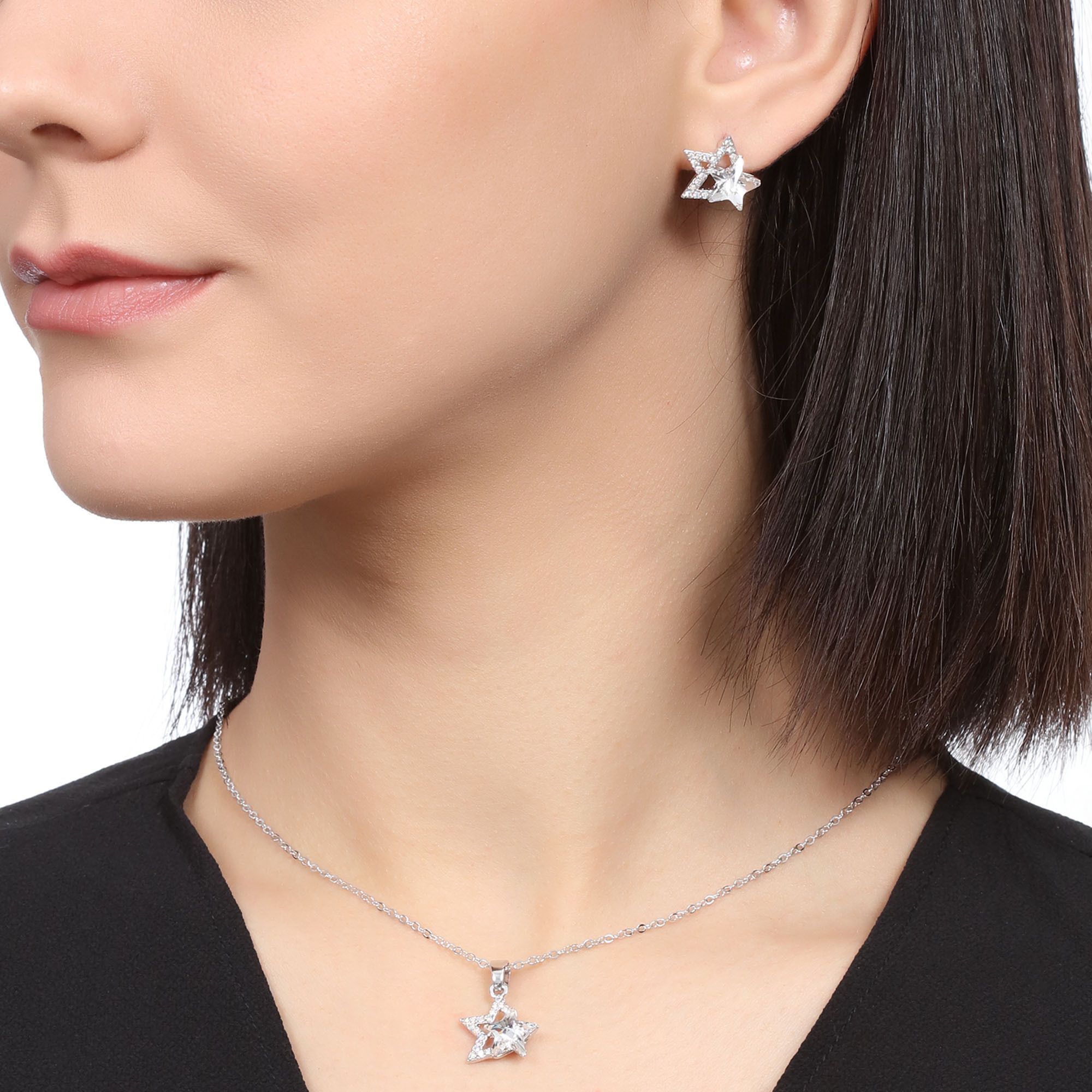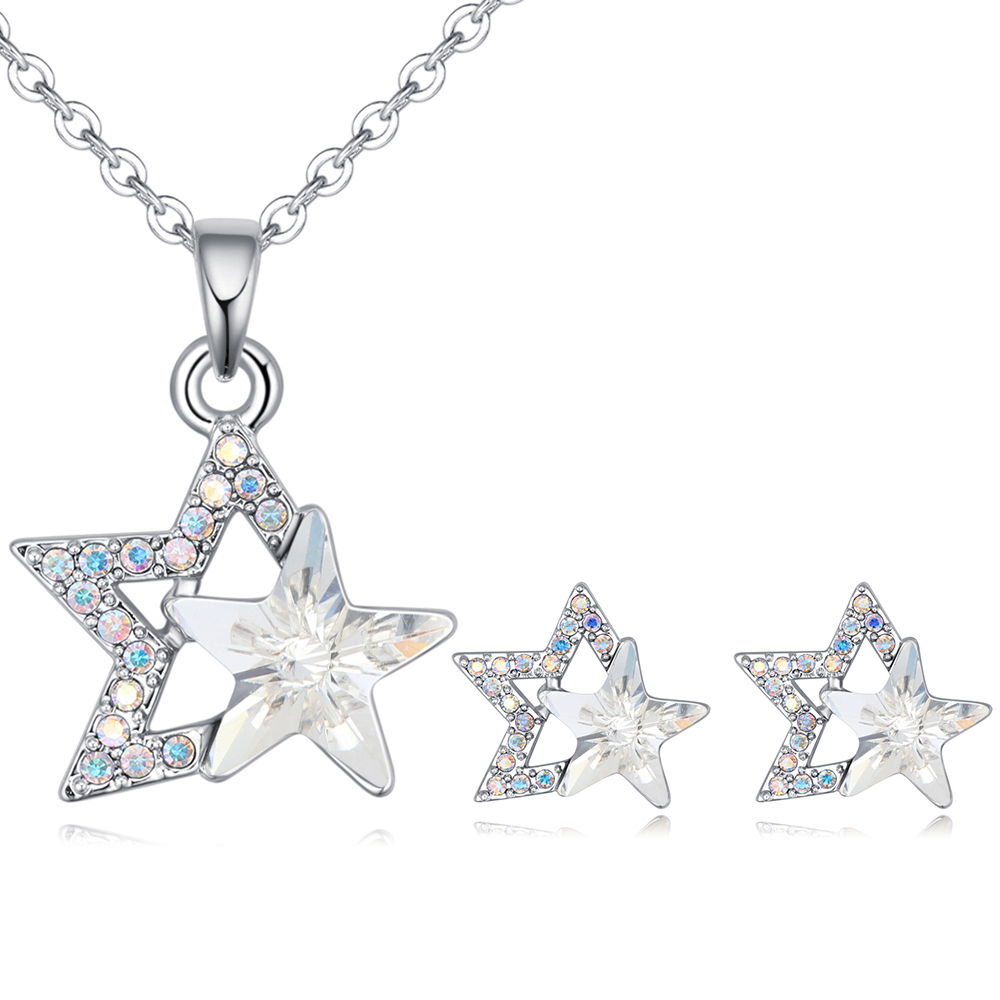 Hermoso juego de aretes y dije con cadena en baño de oro blanco de 18 quilates, diseño de estrellas con incrustraciones de cristales en color blanco. Fabricado en una estructura de aleación de platino con rodio sin níquel.