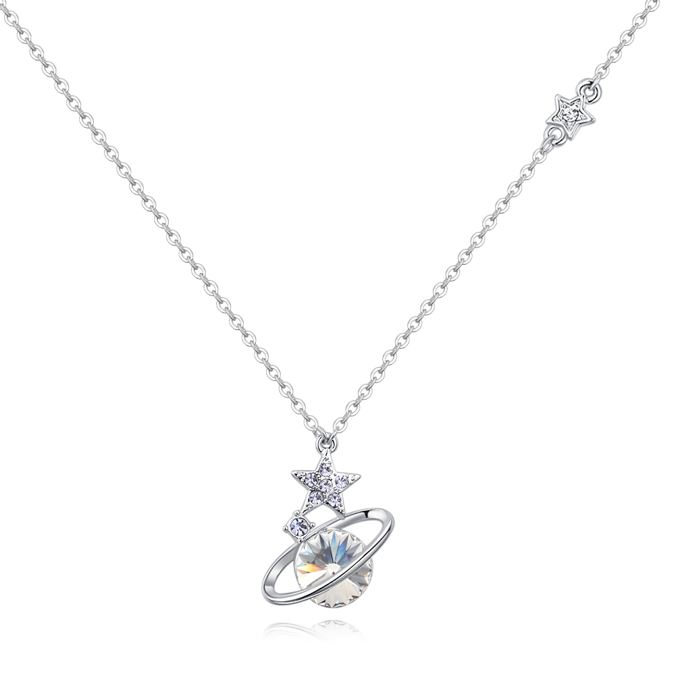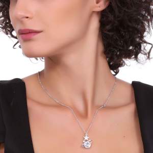 Dije con cadena en baño de oro blanco de 18 quilates, original diseño de aro y estrella con incrustaciones de cristales en color blanco. Fabricado en una estructura de aleación de platino con rodio sin níquel.