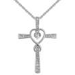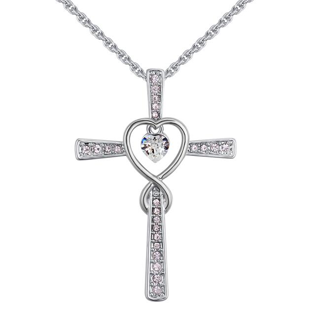 Dije con cadena en baño de oro blanco de 18 quilates, original diseño de cruz y corazón al centro, con cristal blanco corte corazón e incrustaciones de cristales en color blanco. Fabricado en una estructura de aleación de platino con rodio sin níquel.