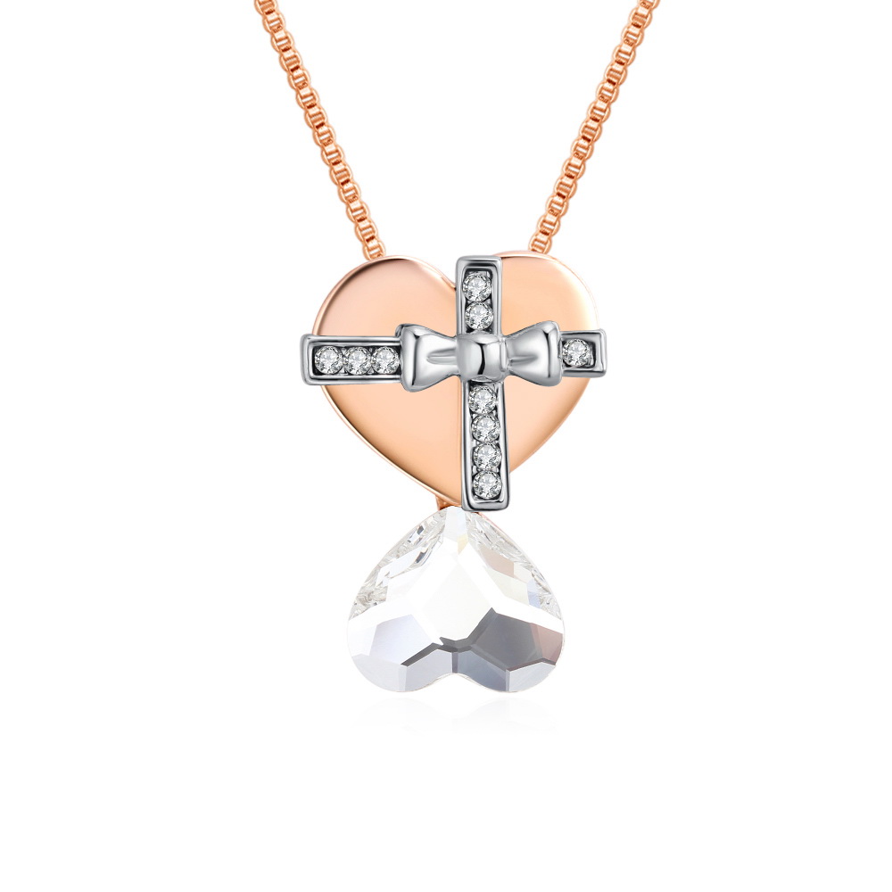 Hermoso dije en baño de oro rosa de 18 quilates , diseño de corazón doble con cruz en baño de oro blanco con incrustaciones de cristales en color blanco y tornasol. Fabricado en una estructura de aleación de platino con rodio sin níquel. 1. Joyería Hipo alergénica. 2. Incluye cajita de Joyería. 4. Garantía de 30 días por defectos de fabrica.
