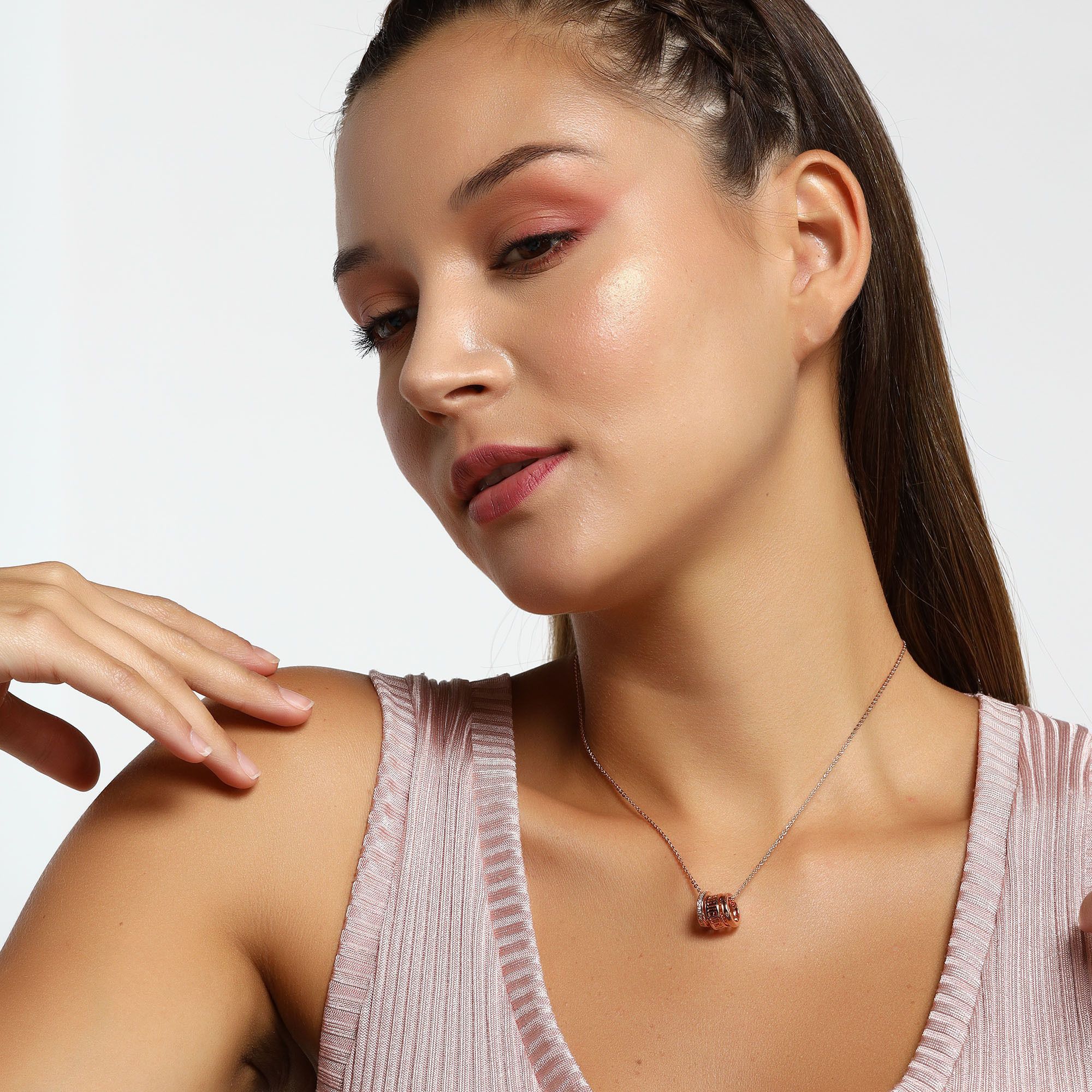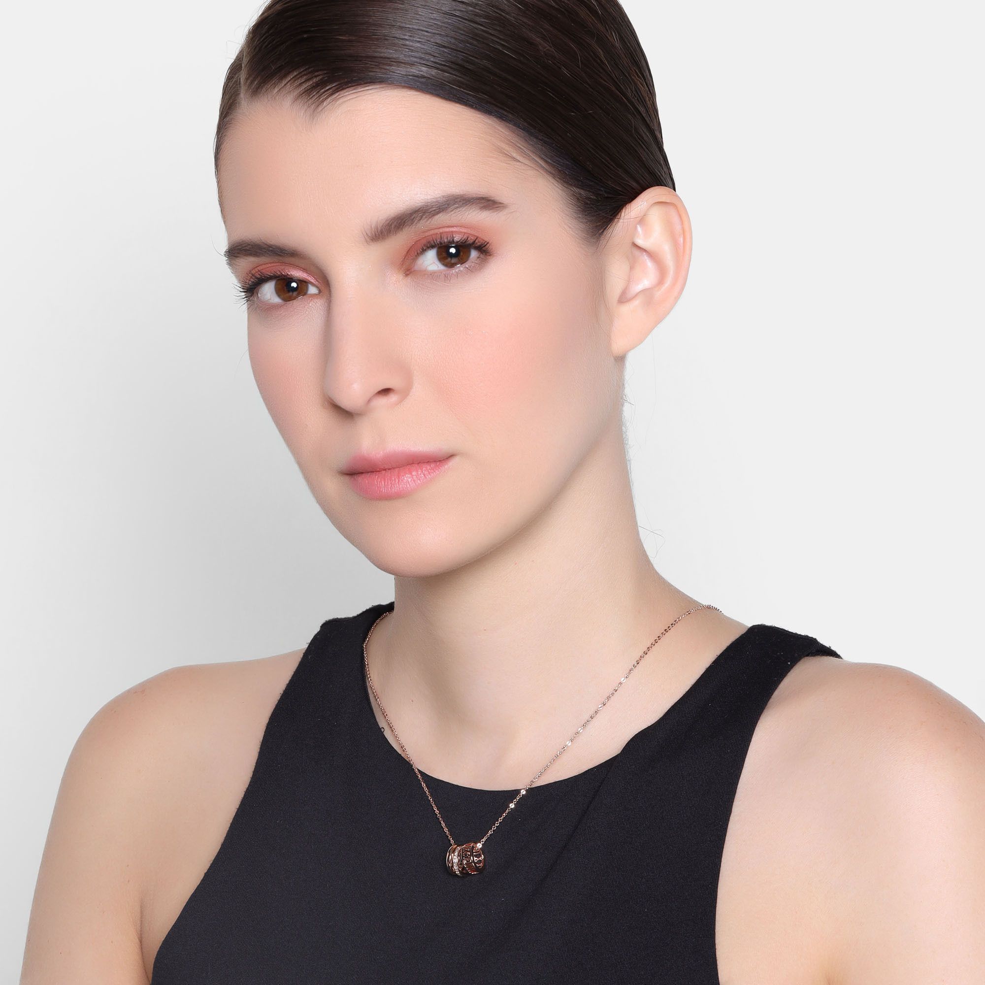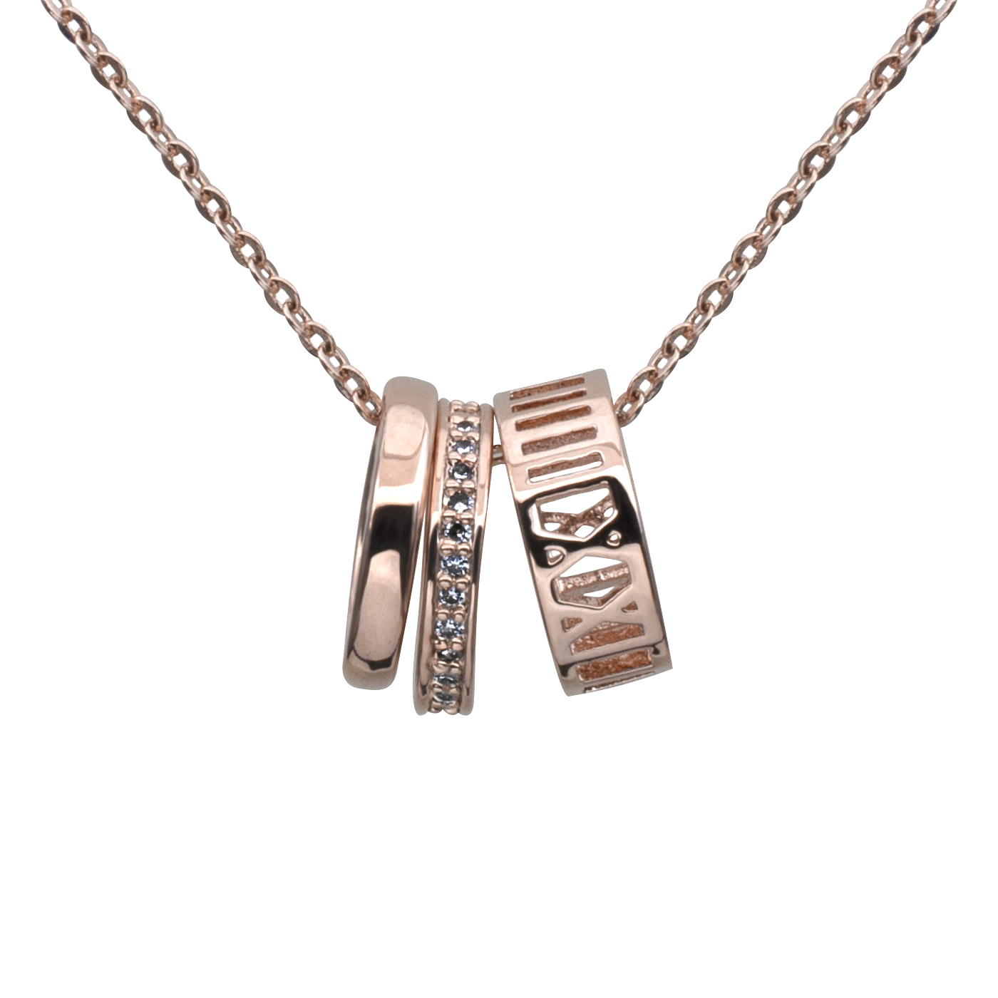 Precioso dije con cadena en baño de oro rosa de 18 quilates, diseño de anillos con detalles de numeros romanos y cristales incrustados en color blanco. Perfecto para cualquier ocasión. Fabricado en una estructura de aleación de platino con rodio sin níquel.