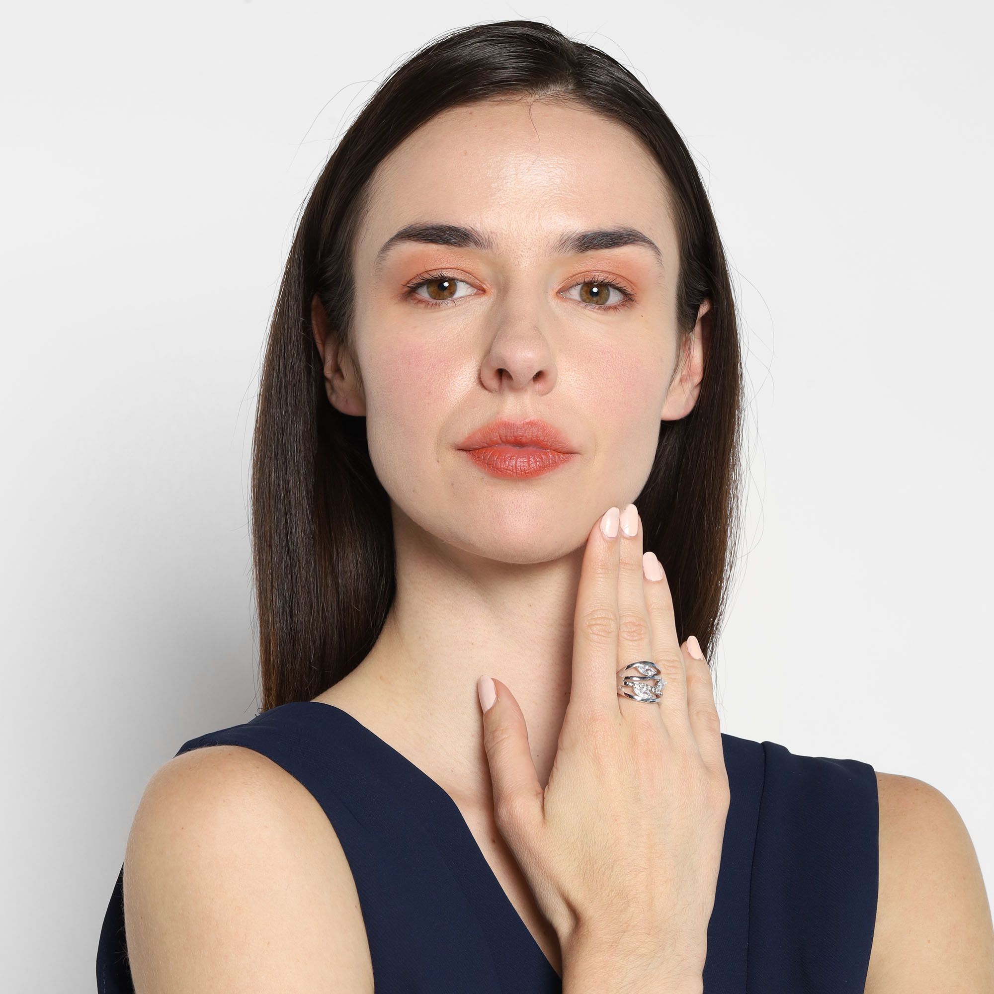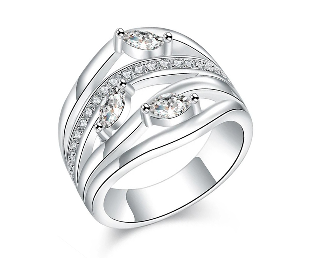 Hermoso anillo en baño de oro blanco de 18 quilates, fino diseño estilo anillo múltiple, con aros entrelazados e incrustaciones de cristales color blanco. Fabricado en una estructura de aleación de platino con rodio sin níquel.