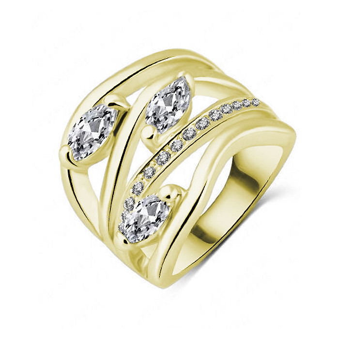 Hermoso anillo en baño de oro amarillo de 18 quilates, fino diseño estilo anillo múltiple, con aros entrelazados e incrustaciones de cristales morado y blanco. Fabricado en una estructura de aleación de platino con rodio sin níquel.