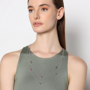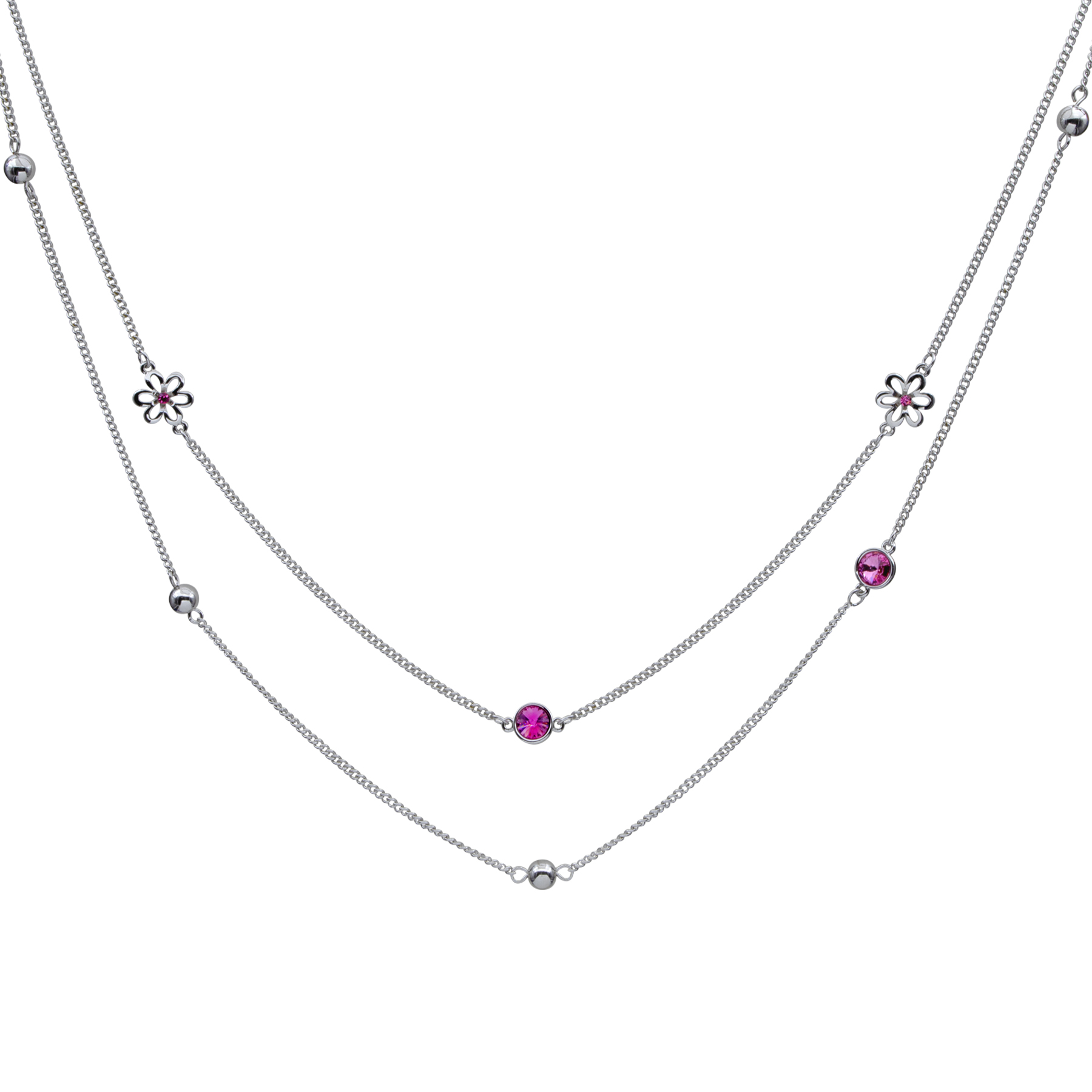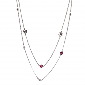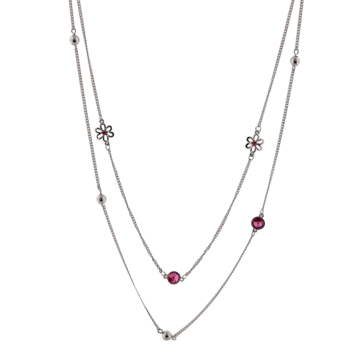Precioso collar doble en baño de oro blanco de 18 quilates, diseño de flores con incrustaciones de cristales en color rosa. Fabricado en una estructura de aleación de platino con rodio sin níquel.
