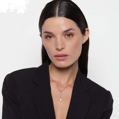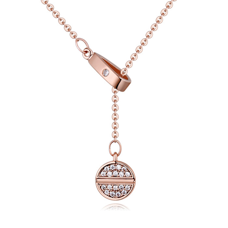 Dije con cadena en baño de oro rosa de 18 quilates, diseño de circulo con incrustación de cristal en color blanco. Fabricado en una estructura de aleación de platino con rodio sin níquel.