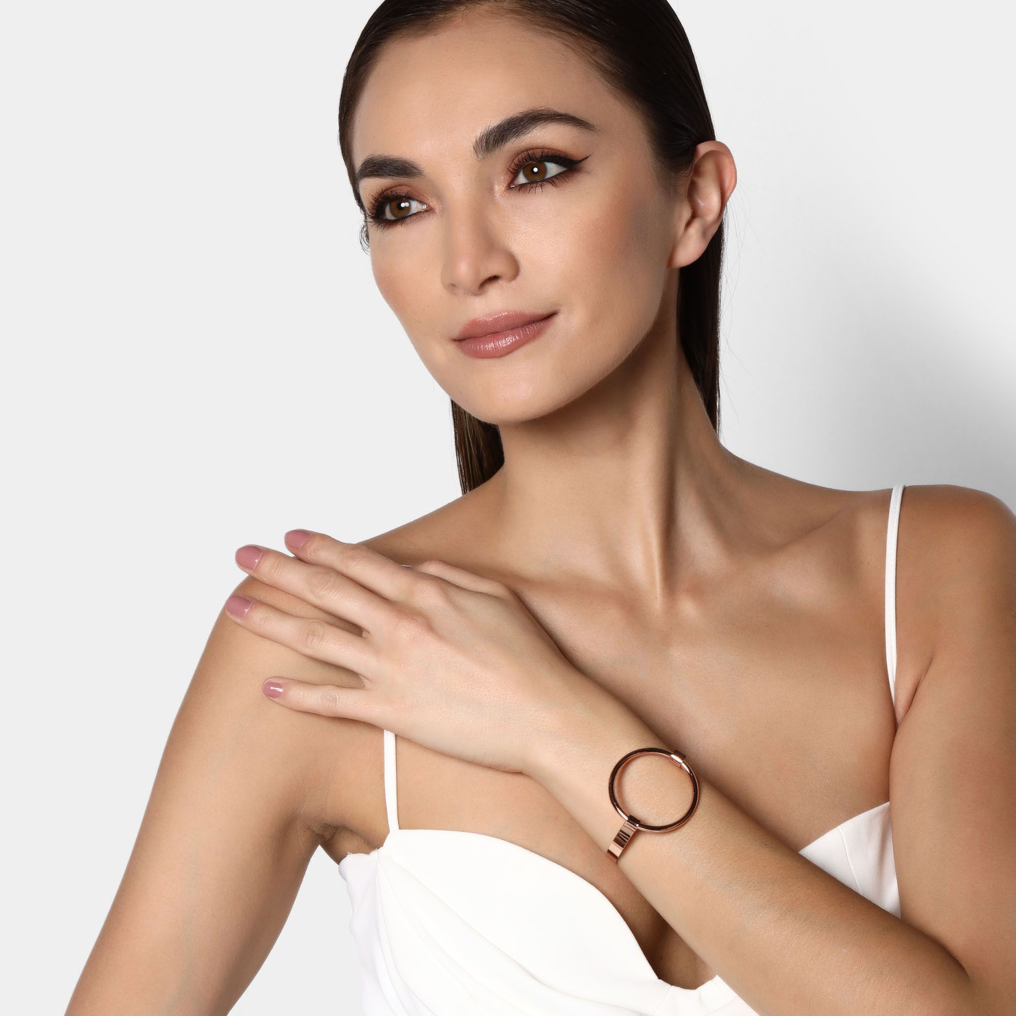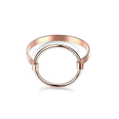 Hermoso brazalete ajustable en acero inoxidable en color rosa, elaborado con los materiales mas resistentes y con diseño elegante.