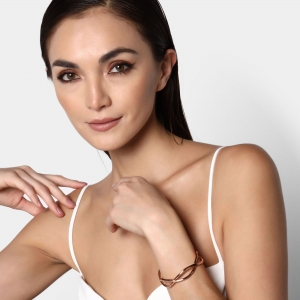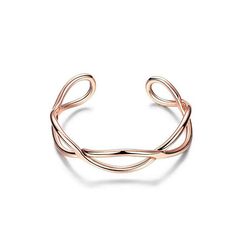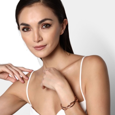 Hermoso brazalete ajustable en acero inoxidable en color rosa, elaborado con los materiales mas resistentes y con un diseño elegante trensado.