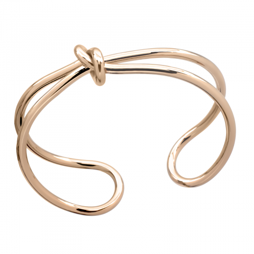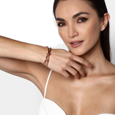 Hermoso brazalete ajustable en acero inoxidable en color rosa, elaborado con los materiales mas resistentes y con un diseño elegante de moño.