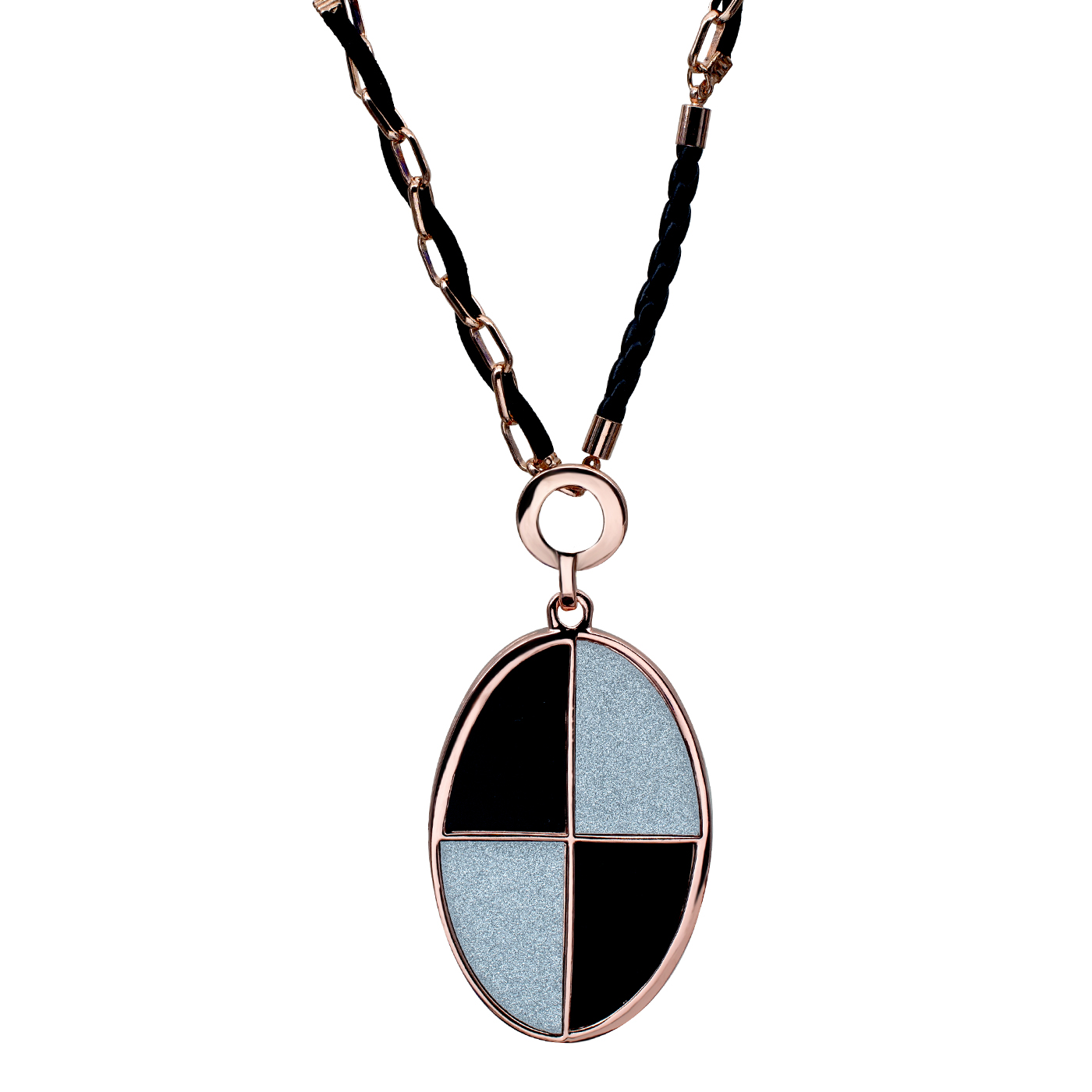 Elegante collar en baño de oro rosa de 18 quilates, diseño de ovalo partido en cuatro con placa negra y chispas de cristales en color plata. Fabricado en una estructura de aleación de platino con rodio sin níquel.
