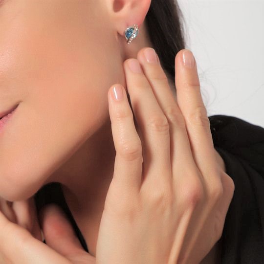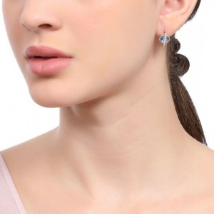 Finos aretes en baño de oro blanco y rosa de 18 quilates con cristal azul corte brillante e incrustaciones de cristales en color blanco. Fabricado en una estructura de aleación de platino con rodio sin níquel.