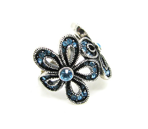 Precioso anillo, en baño de oro blanco de 18 quilates, lindo diseño de flores, acabado antiguo, detalles en relieve e incrustaciones de cristales en color azul. Fabricado en una estructura de aleación de platino con rodio sin níquel.