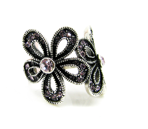Precioso anillo, en baño de oro blanco de 18 quilates, lindo diseño de floresa, en acabado antiguo, detalles en relieve e incrustaciones de cristales en color lila. Fabricado en una estructura de aleación de platino con rodio sin níquel.