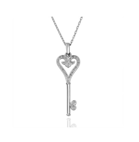 Exclusivo y original dije en baño de oro blanco de 18 quilates, diseño de Llave con incrustaciones de delicadas chispas de cristales blancos. El collar tiene una cadena de 40 cm con extensión de 5 cm. Fabricado en una estructura de aleación de platino con rodio sin níquel.