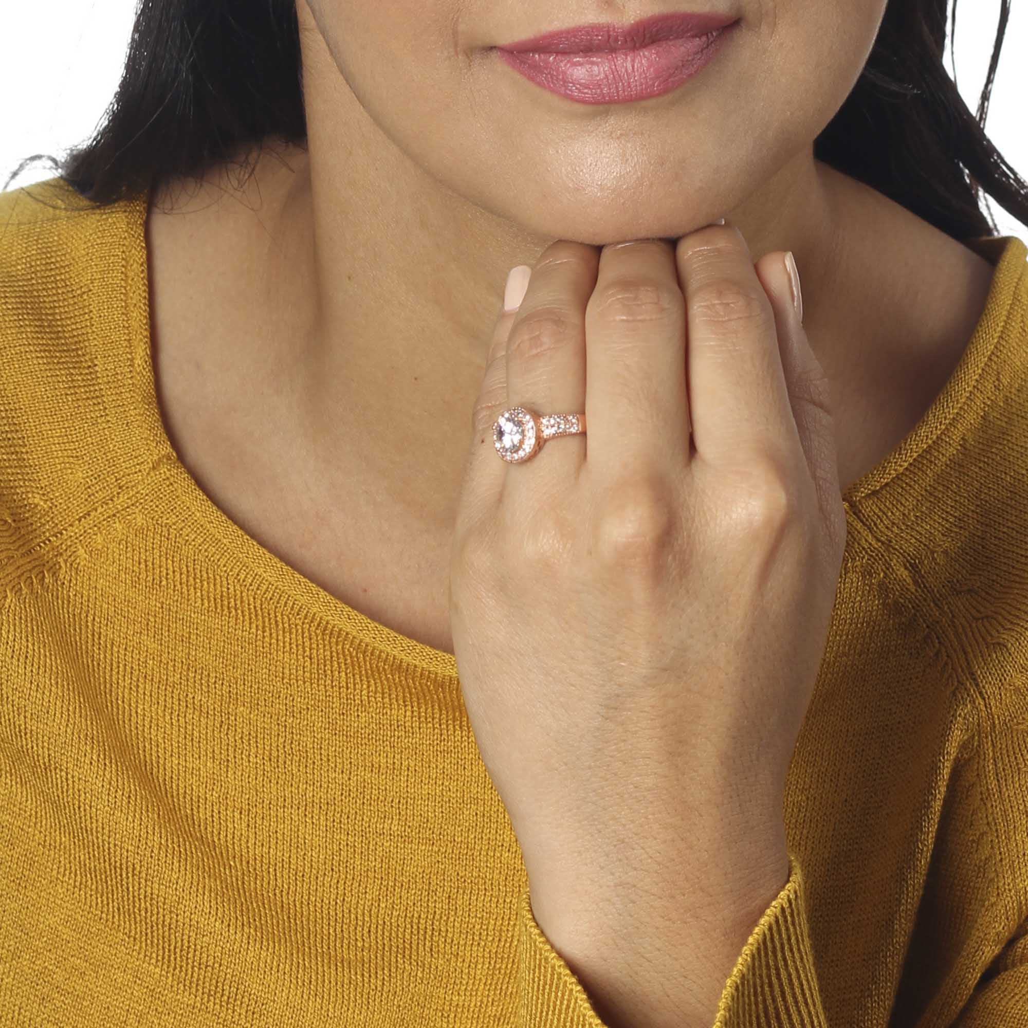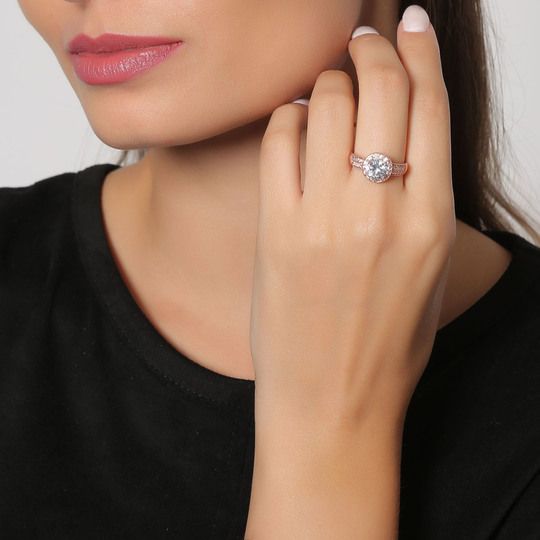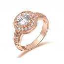 Delicado anillo, en baño de oro rosa de 18 quilates, diseño de círculo, con cristal blanco corte brillante e incrustaciones de cristales en color blanco. Fabricado en una estructura de aleación de platino con rodio sin níquel.