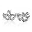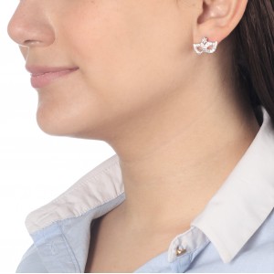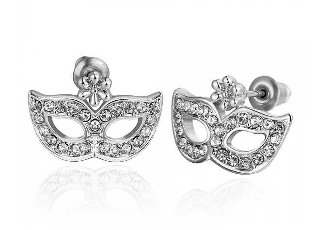 Preciosos aretes en baño de oro blanco de 18 quilates , diseño de antifaz con incrustaciones de cristales en color blanco. Fabricado en una estructura de aleación de platino con rodio sin níquel.