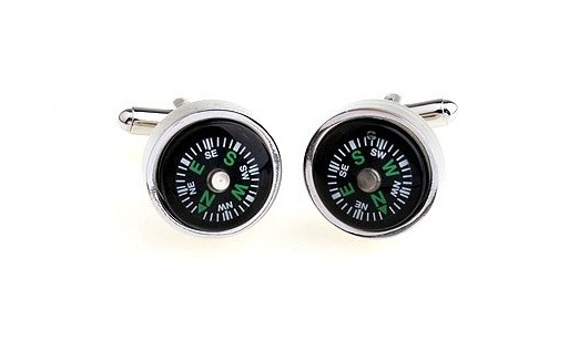Mancuernillas de acero inoxidable, bañadas en oro blanco de 18 quilates, con diseño de brújula en 3D, con líquido encapsulado en su interior. Fabricado en una estructura en aleación de platino con rodio sin níquel.