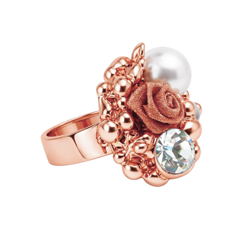 Exclusivo anillo, en baño de oro rosa de 18 quilates, original diseño con rosa hecha de malla, perlas en tonos crema, detalles en relieve e incrustaciones de cristales blancos. Fabricado en una estructura de aleación de platino con rodio sin níquel.