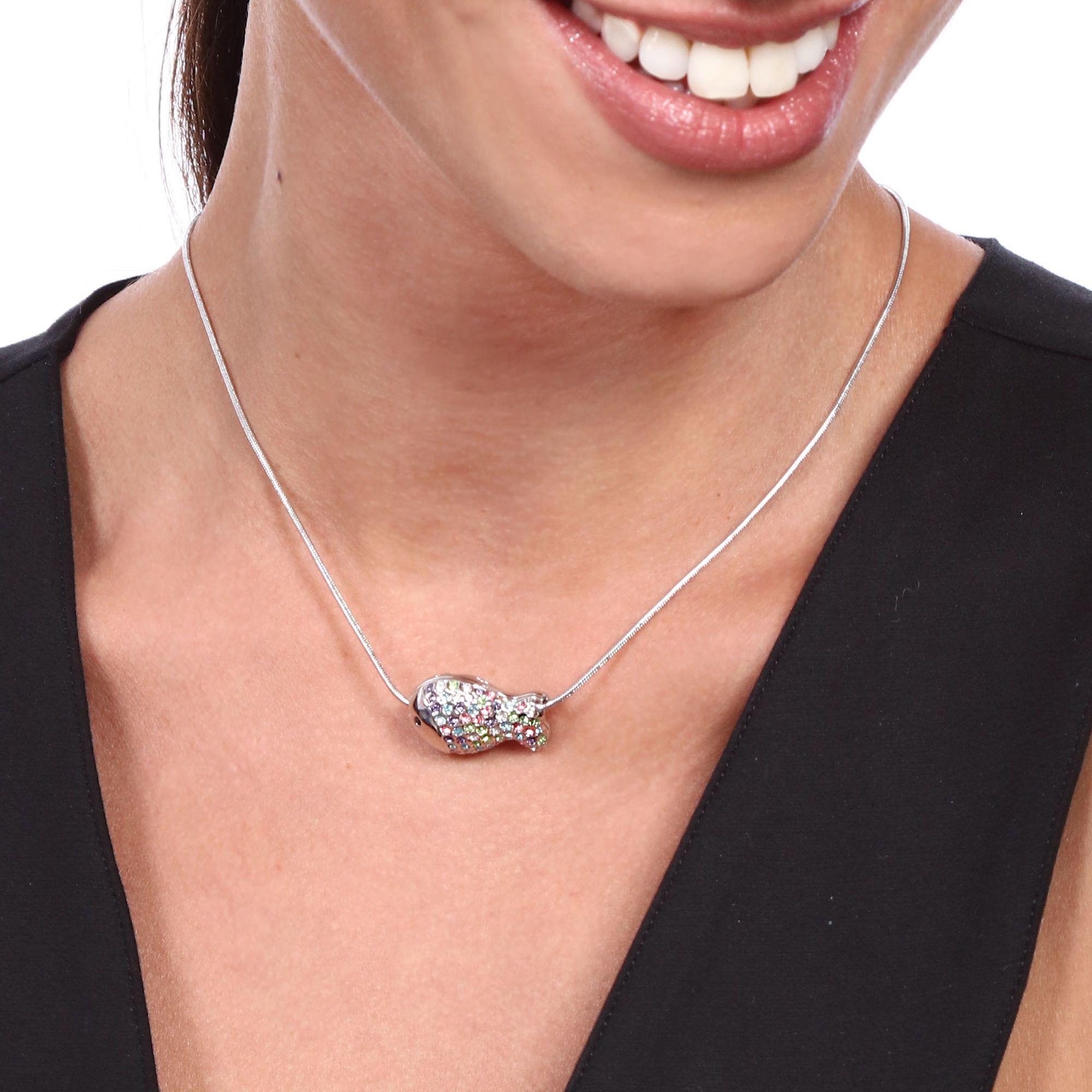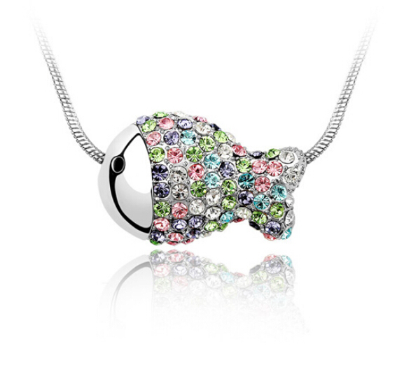 Dije con cadena en baño de oro blanco de 18 quilates, lindo diseño de pez con incrustaciones de cristales en colores. Fabricado en una estructura de aleación de platino con rodio sin níquel.