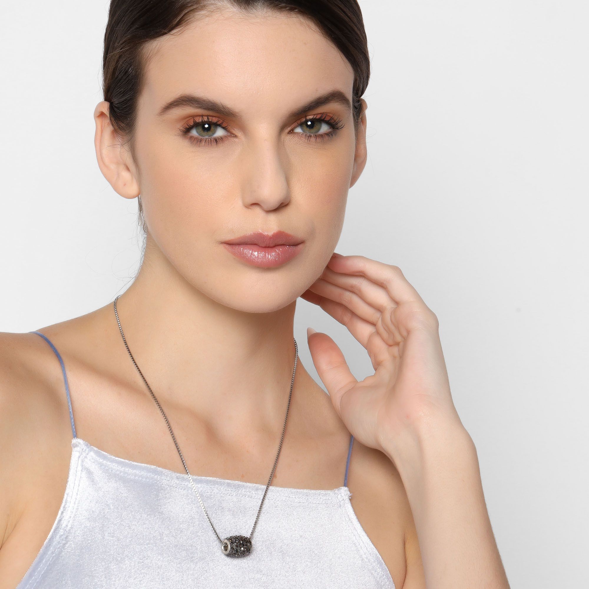 Hermoso dije con cadena en acero inoxidable, diseño de cilindro con incrustaciones de cristales en color gris.