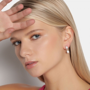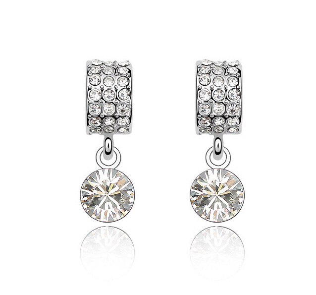 Lindos aretes en baño de oro blanco de 18 quilates , fino diseño con incrustaciones de cristales en color blanco. Fabricado en una estructura de aleación de platino con rodio sin níquel.