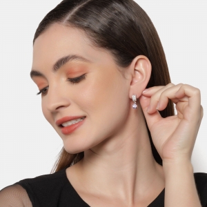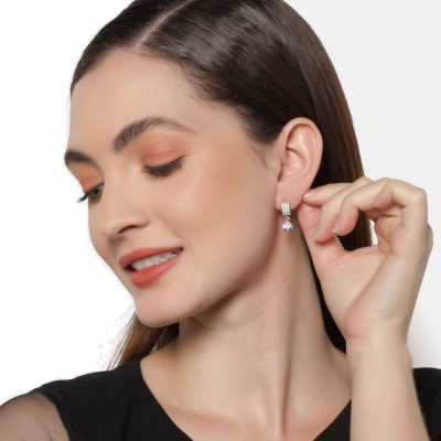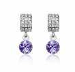 Lindos aretes en baño de oro blanco de 18 quilates , con incrustaciones de cristales en color blanco y morado. Fabricado en una estructura de aleación de platino con rodio sin níquel.