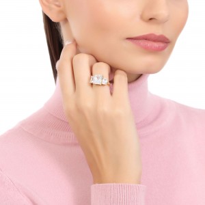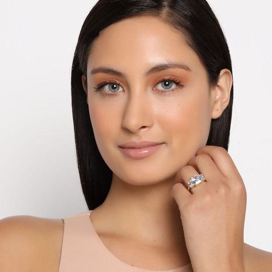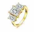 Anillo en baño de oro amarillo de 18 quilates, fino diseño con cristal blanco corte princesa e incrustaciones de cristales en color blanco. Fabricado en una estructura de aleación de platino con rodio sin níquel.