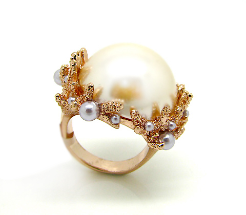 Elegante anillo, en baño de oro amarillo de 18 quilates, con perla beige grande, pequeñas perlas grises y blancas, detalles dorados e incrustaciones de cristales blancos. Fabricado en una estructura de aleación de platino con rodio sin níquel.