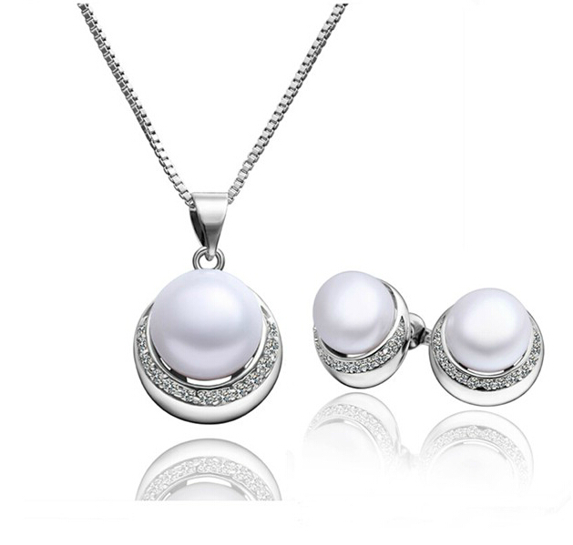 Hermoso juego de aretes y dije en baño de oro blanco de 18 quilates , fino diseño de aro con perla blanca e incrustaciones de cristales en color blanco. Fabricado en una estructura de aleación de platino con rodio sin níquel.
