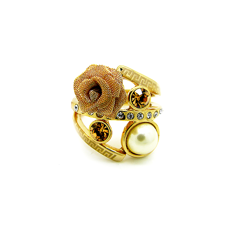 Hermoso anillo, en baño de oro amarillo de 18 quilates, original diseño, rosa dorada hecha de malla, perla beige, grecas grabadas, cristales tabaco e incrustaciones de cristales blancos. Fabricado en una estructura de aleación de platino con rodio sin níquel.