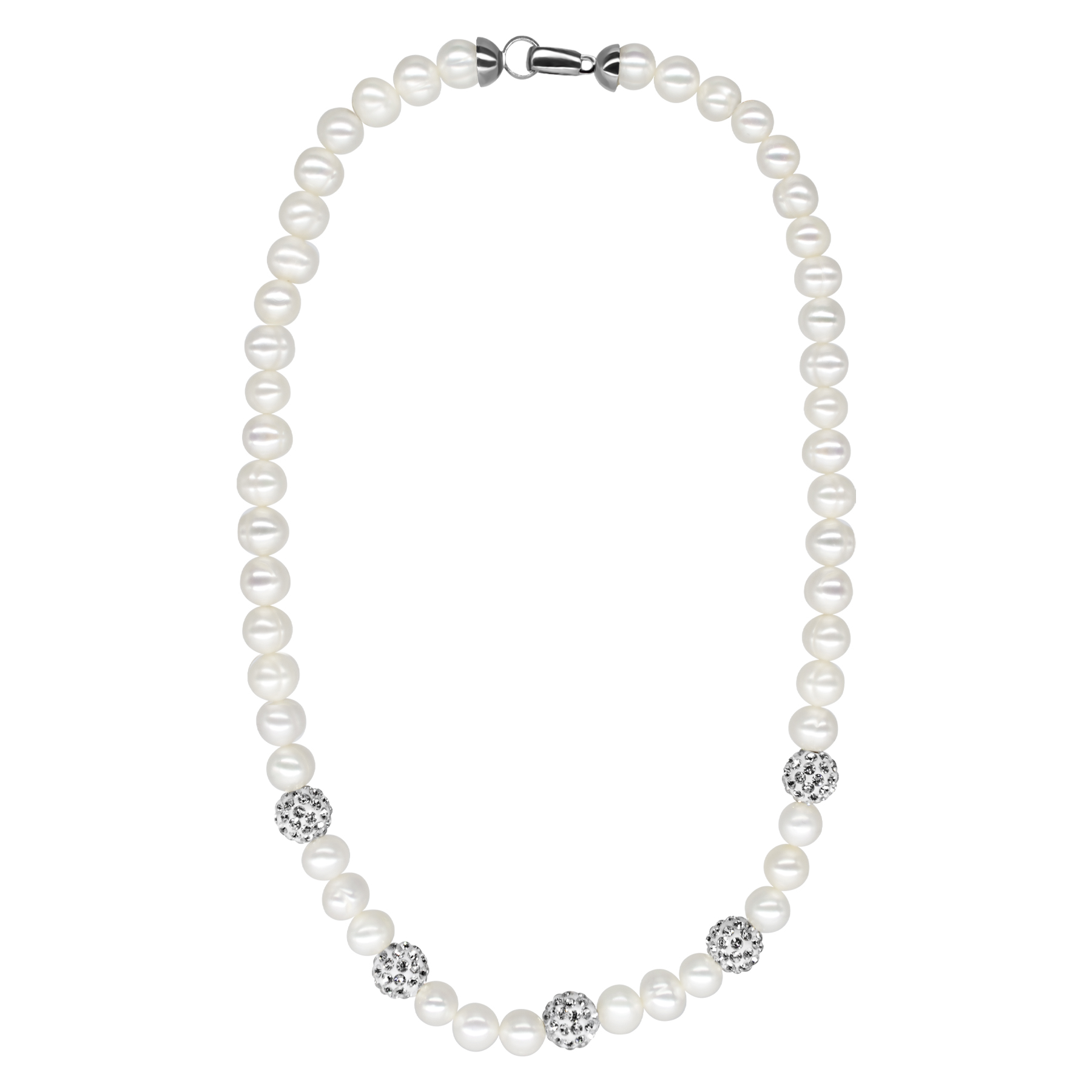 Lindo collar de perlas cultivadas, Elegante diseño, perlas color beige y esferas blancas con incrustaciones de cristales blancos.
