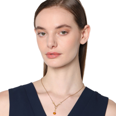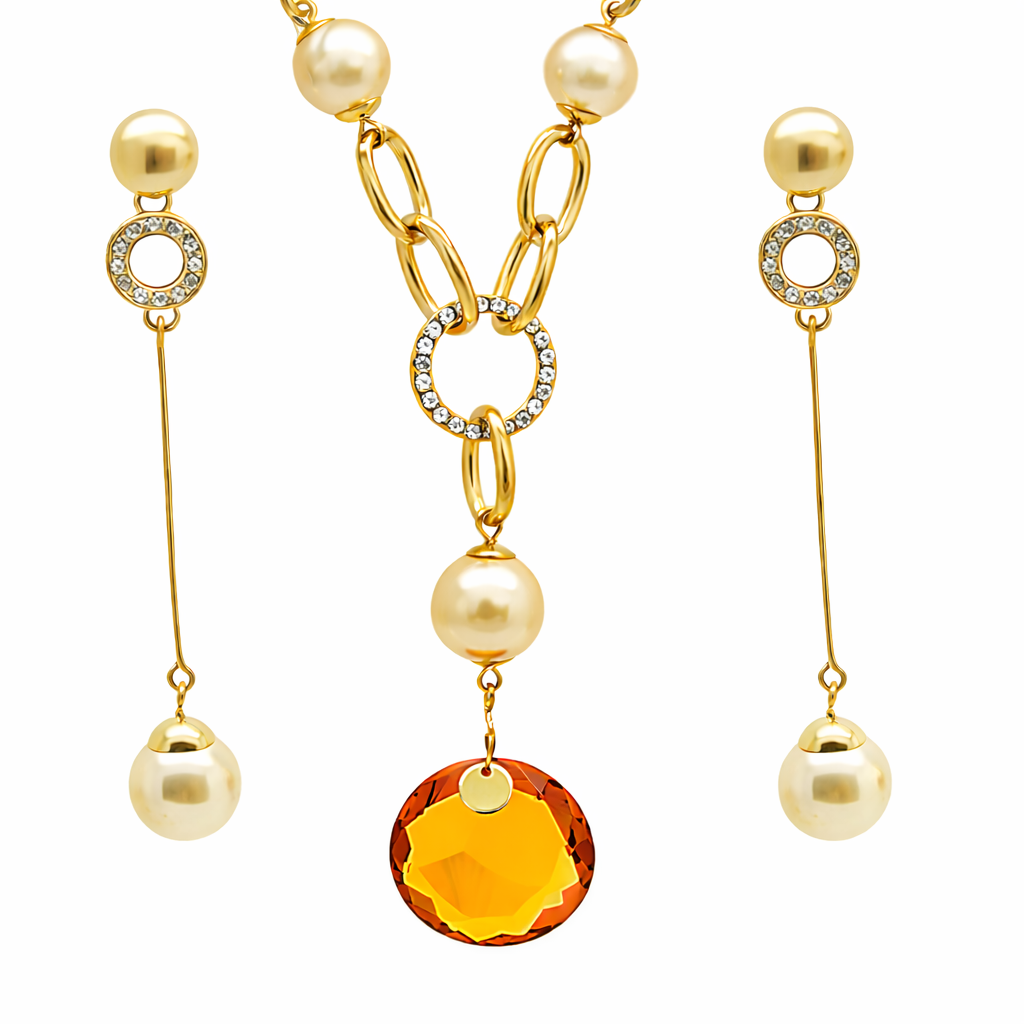 Juego de Collar y aretes en baño de oro amarillo de 18 quilates, diseño de aros acbado mate, con perlas blancas y cristal color ámbar corte circular.. El collar tiene una cadena de 40 cm con extensión de 5 cm. Fabricado en una estructura de aleación de platino con rodio sin níquel.
