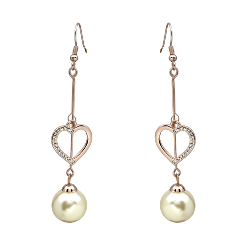 Bonitos pendientes en baño de oro rosa de 18 quilates con corazón plateado, perla blanca e incrustaciones de cristales blancos. Fabricado en una estructura de aleación de platino con rodio sin níquel.