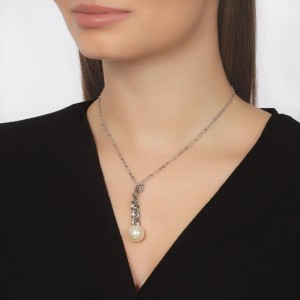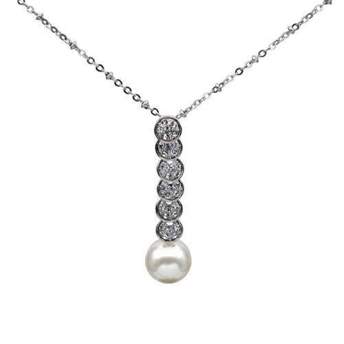 Fino dije con cadena en baño de oro blanco de 18 quilates, diseño de pequeños círculos en cascada, con perla blanca e incrustaciones de cristales blancos. Fabricado en una estructura de aleación de platino con rodio sin níquel.