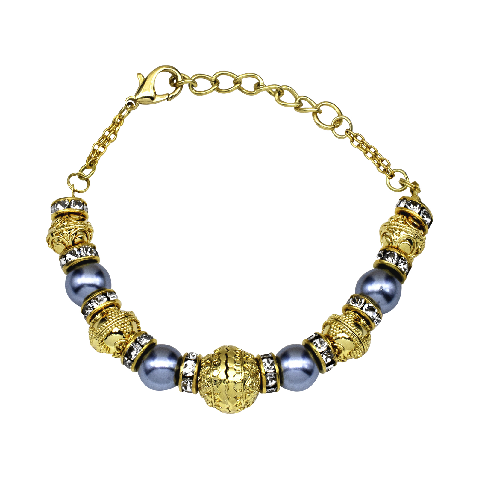 Elegante pulsera en baño de oro amarillo de 18 quilates con perlas oxford, cuentas doradas en relieve e incrustaciones de cristales blancos. Fabricado en una estructura de aleación de platino con rodio sin níquel.