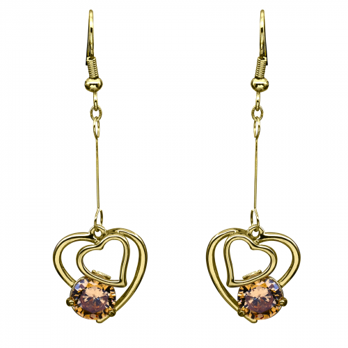 Originales pendientes en baño de oro amarillo de 18 quilates, con corazones e incrustaciones de cristales color ámbar. Fabricado en una estructura de aleación de platino con rodio sin níquel.