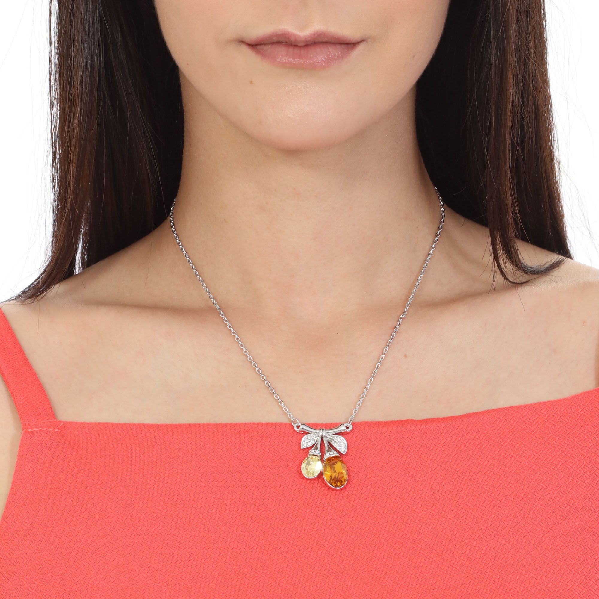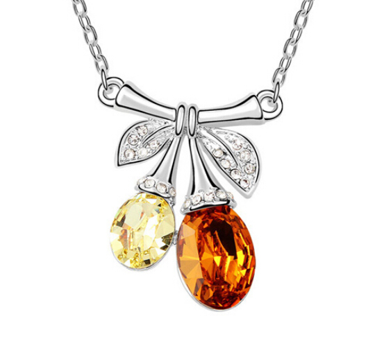 Collar en baño de oro blanco de 18 quilates , diseño de moño con incrustaciones de cristales en color ámbar, amarillo y blanco. Fabricado en una estructura de aleación de platino con rodio sin níquel.