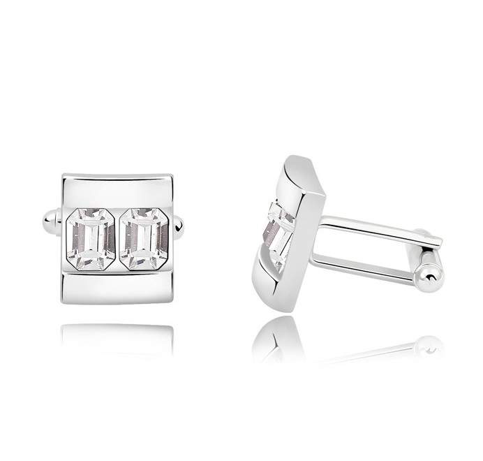 Mancuernillas de acero inoxidable, bañadas en oro blanco de 18 quilates, elegante diseño cuadrado, con incrustaciones de cristales en color blanco corte esmeralda. Fabricado en una estructura en aleación de platino con rodio sin níquel.