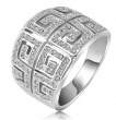 Delicado anillo en baño de oro blanco de 18 quilates, diseño de grecas con incrustaciones de cristales en color blanco.