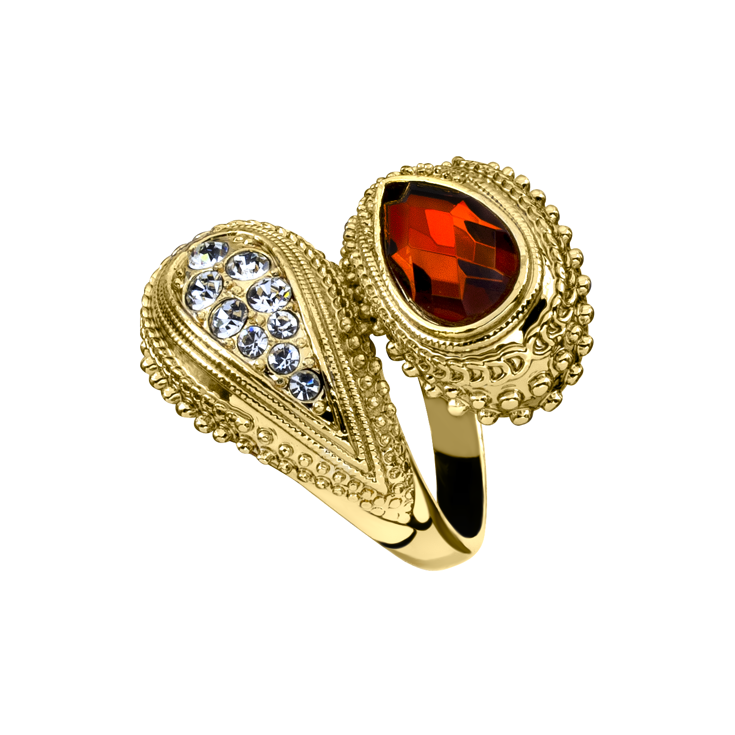 Elegante anillo, en baño de oro amarillo de 18 quilates, original diseño, con grabado de grecas, cristal ámbar e incrustaciones de cristales blancos. Fabricado en una estructura de aleación de platino con rodio sin níquel.