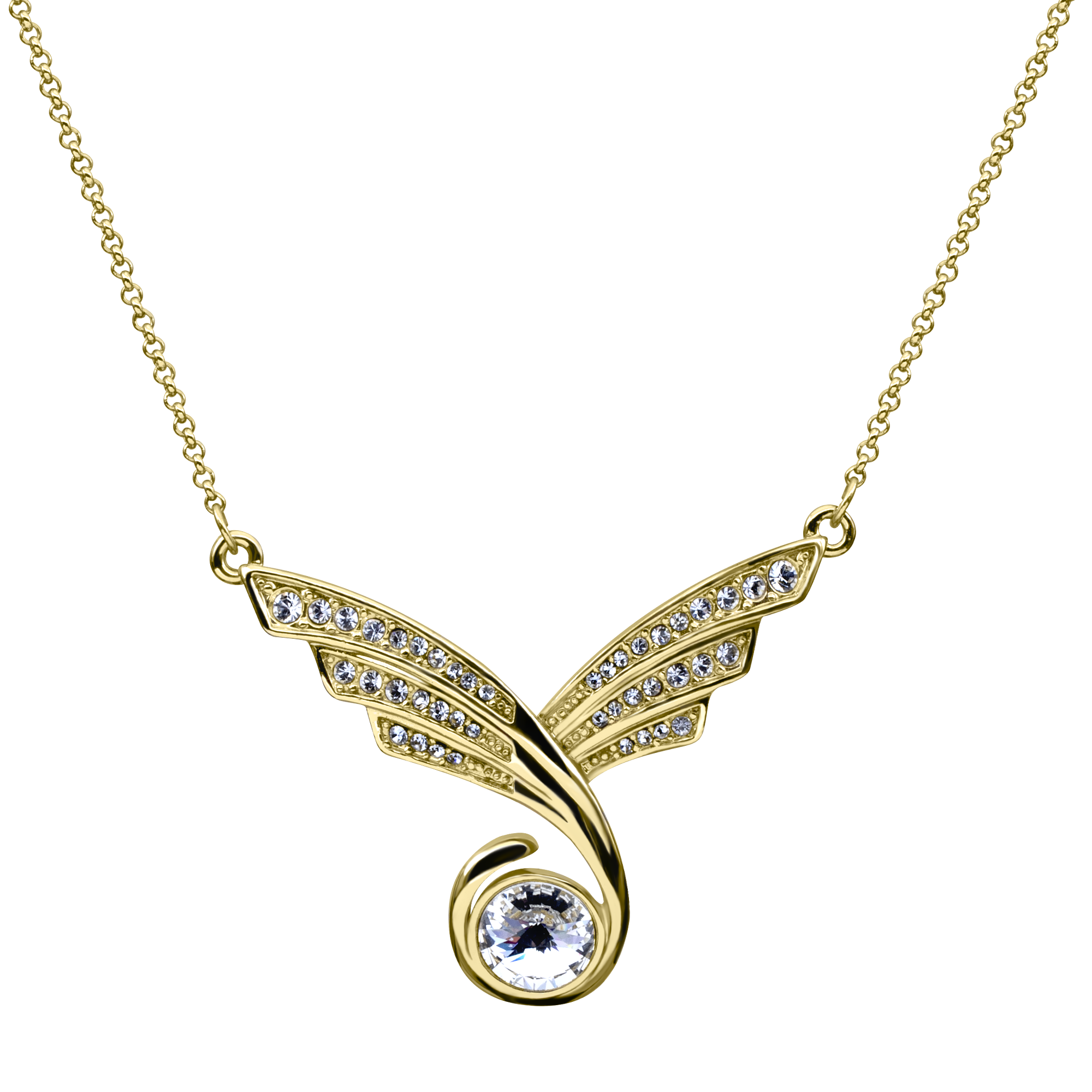 Hermoso collar en baño de oro amarillo de 18 quilates, original diseño de alas estilizadas con incrustaciones de cristales blancos y cristal blanco corte brillante. Fabricado en una estructura de aleación de platino con rodio sin níquel.