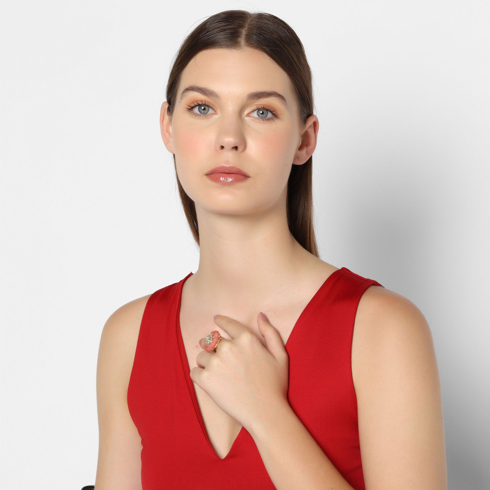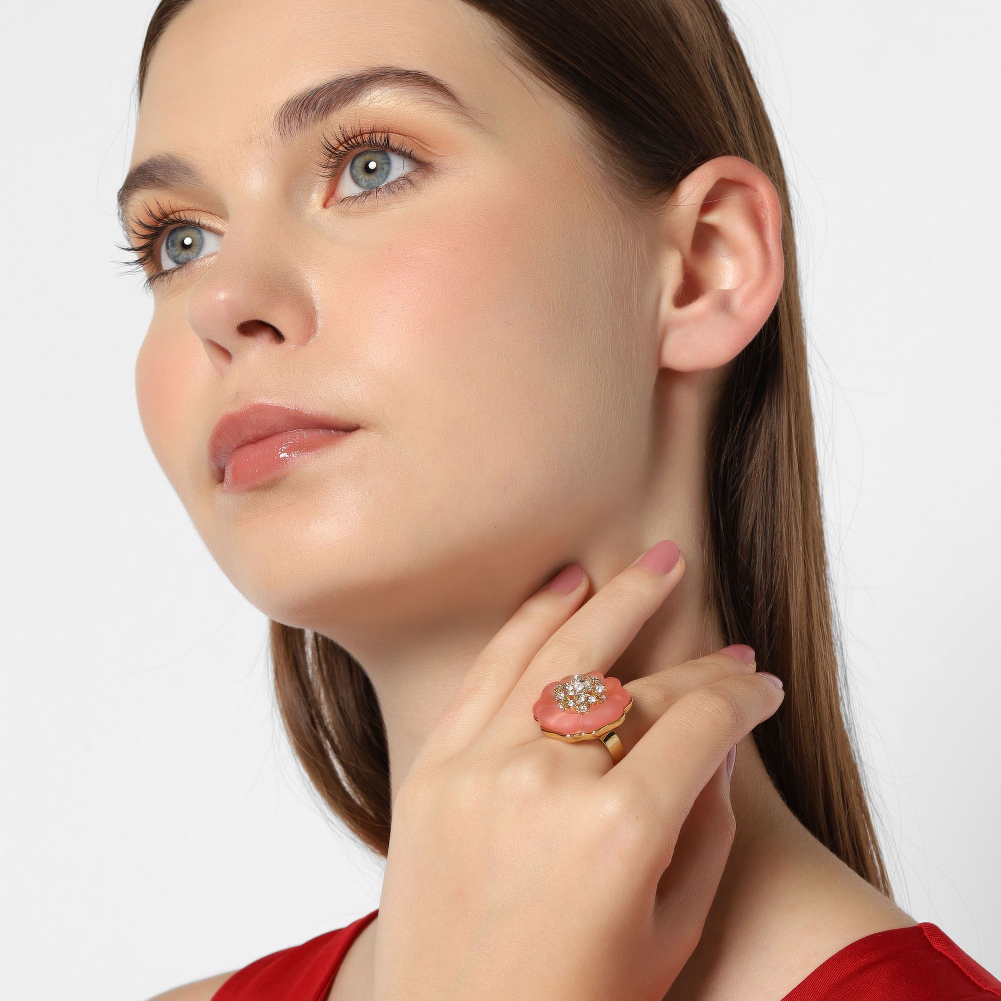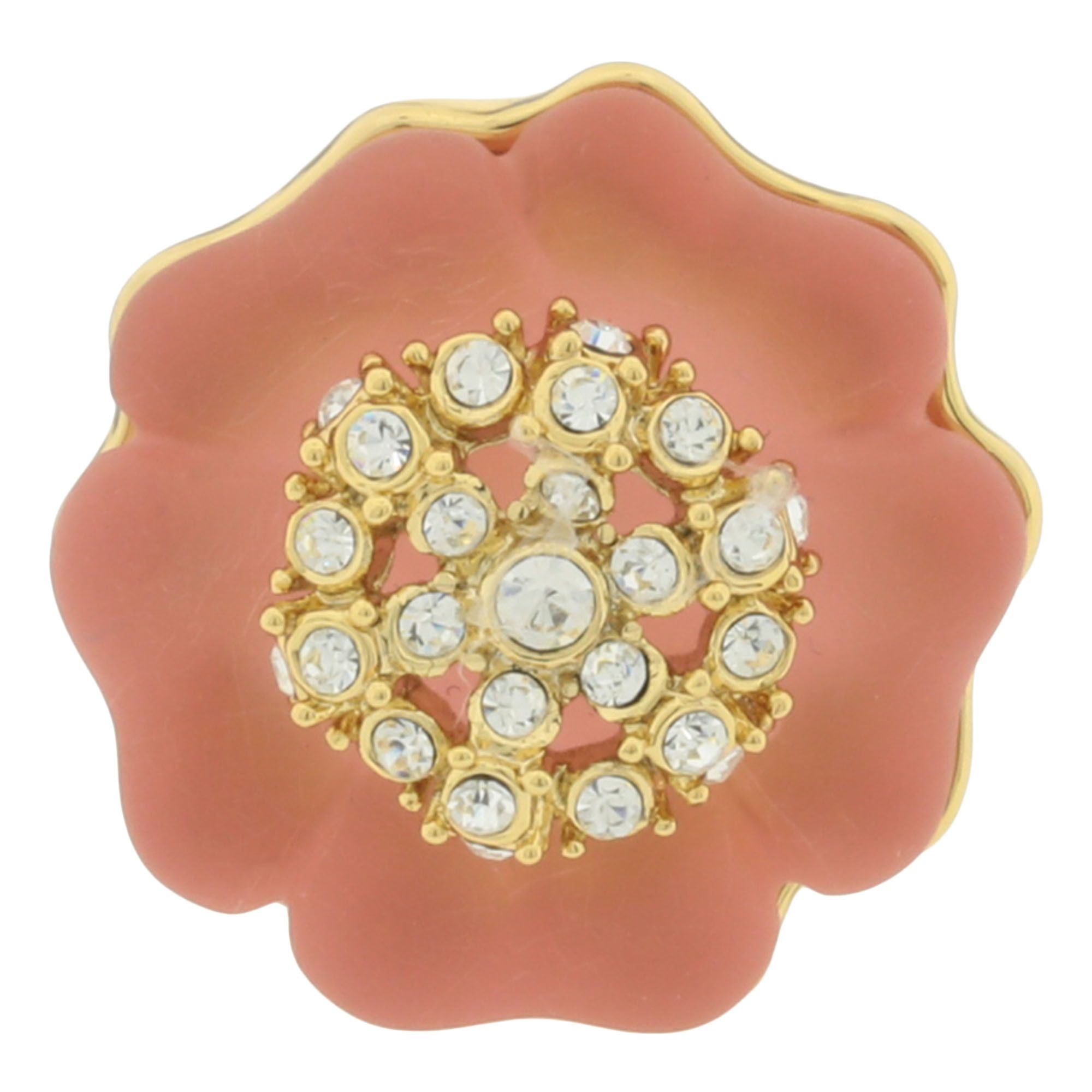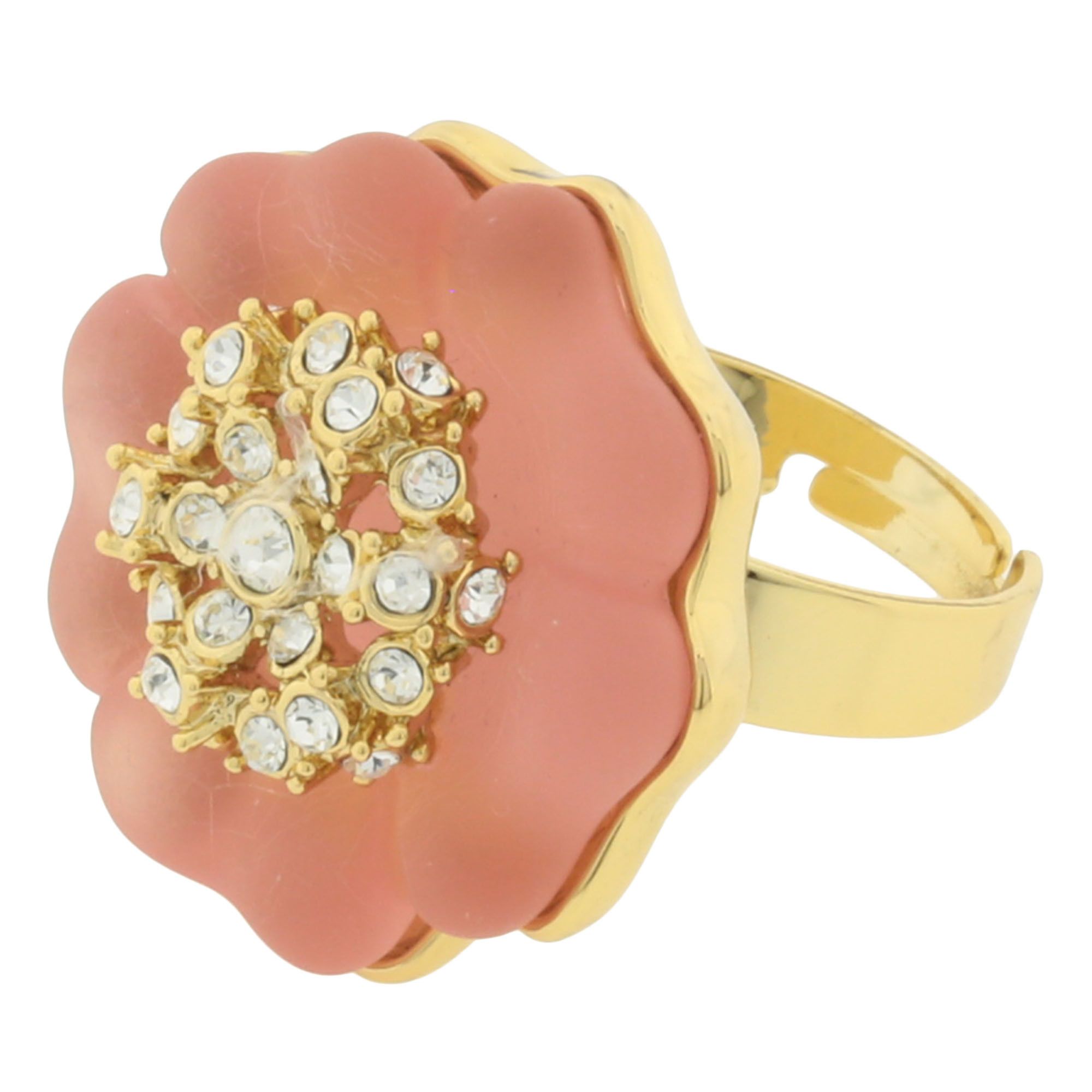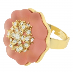 Bonito anillo, en baño de oro amarillo de 18 quilates, con flor de cristal rosa opaco, detalles dorados e incrustaciones de cristales blancos. Fabricado en una estructura de aleación de platino con rodio sin níquel.