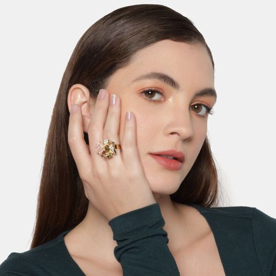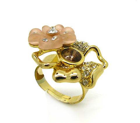 Original anillo, en baño de oro amarillo de 18 quilates, con flor de cristal rosa opaco, cristal tabaco, flor dorada e incrustaciones de cristales blancos. Fabricado en una estructura de aleación de platino con rodio sin níquel.