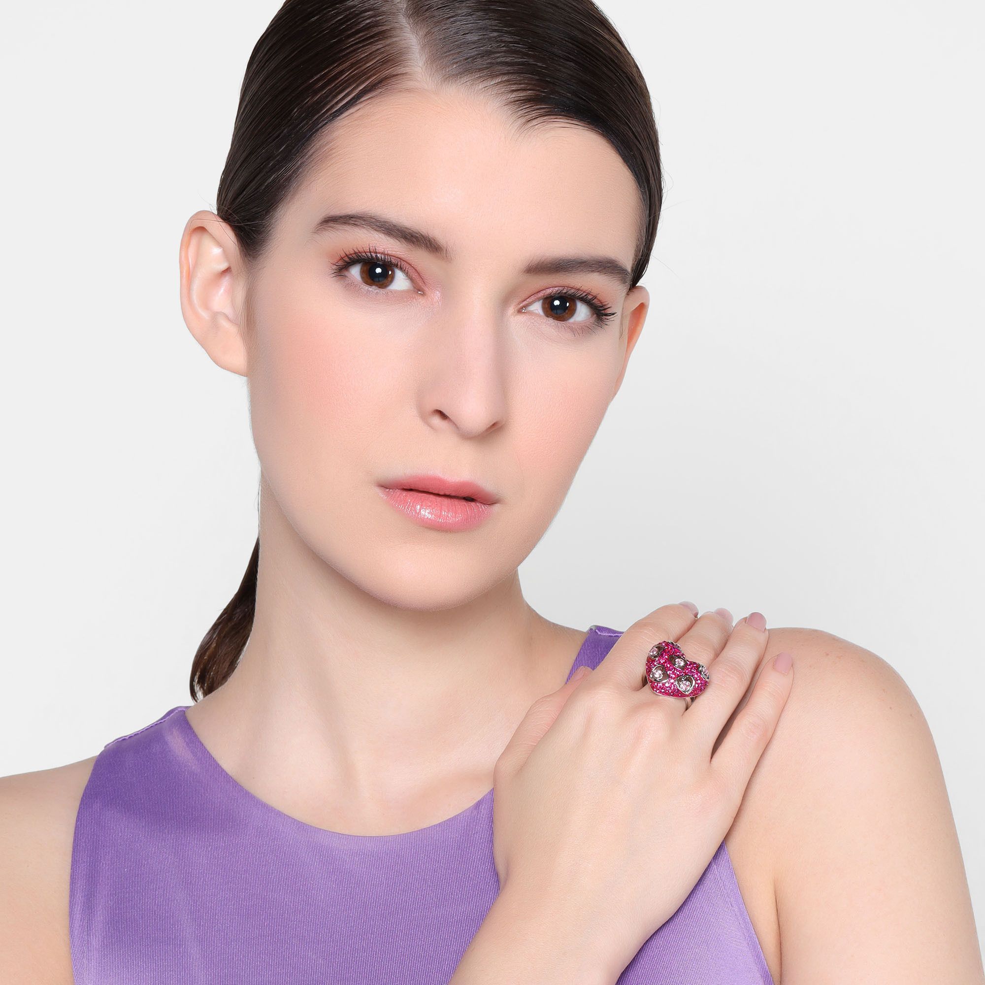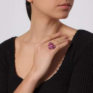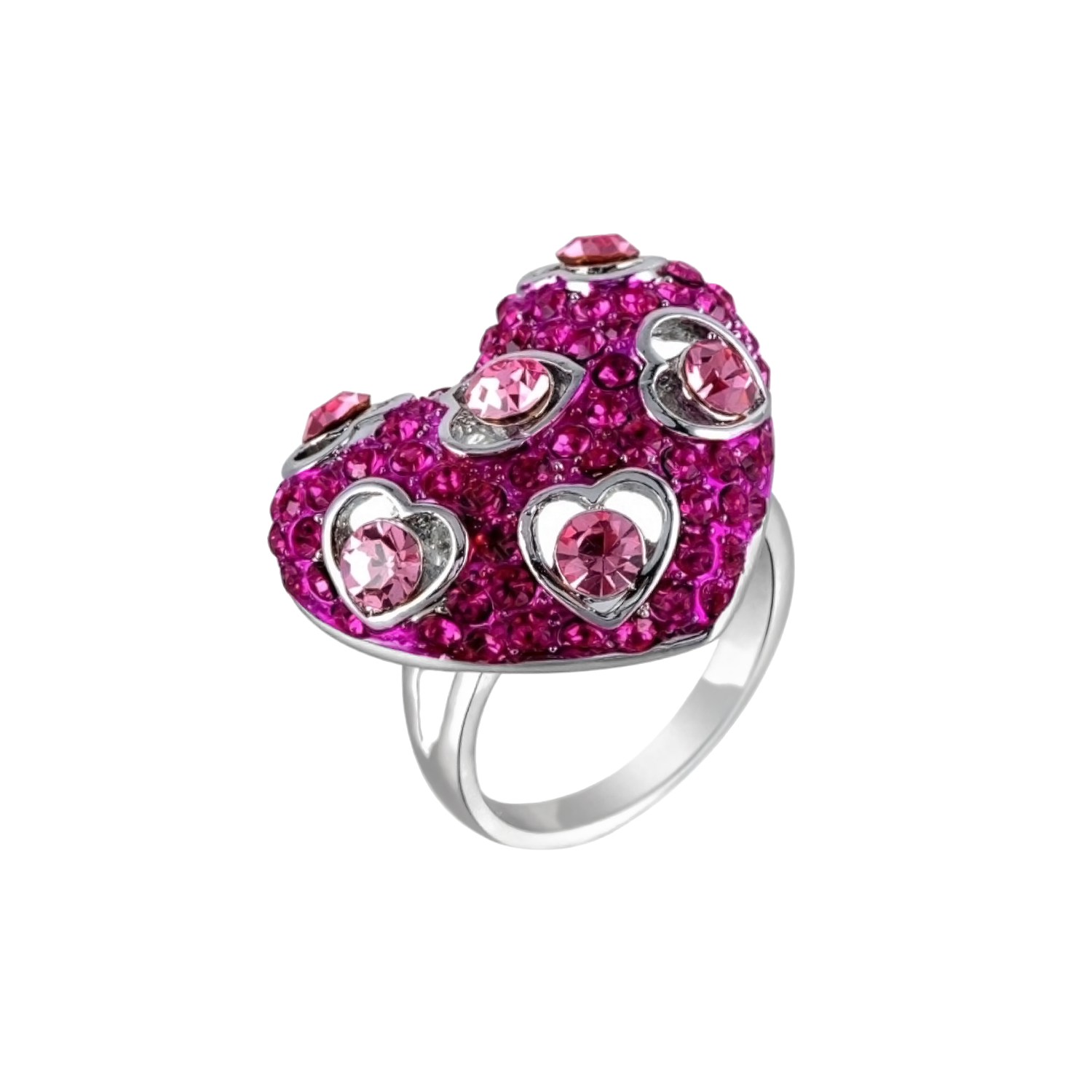 Hermoso anillo, en baño de oro blanco de 18 quilates, diseño de corazón, con incrustaciones de cristales en color fucsia, corazones calados y cristales rosas. Fabricado en una estructura de aleación de platino con rodio sin níquel.