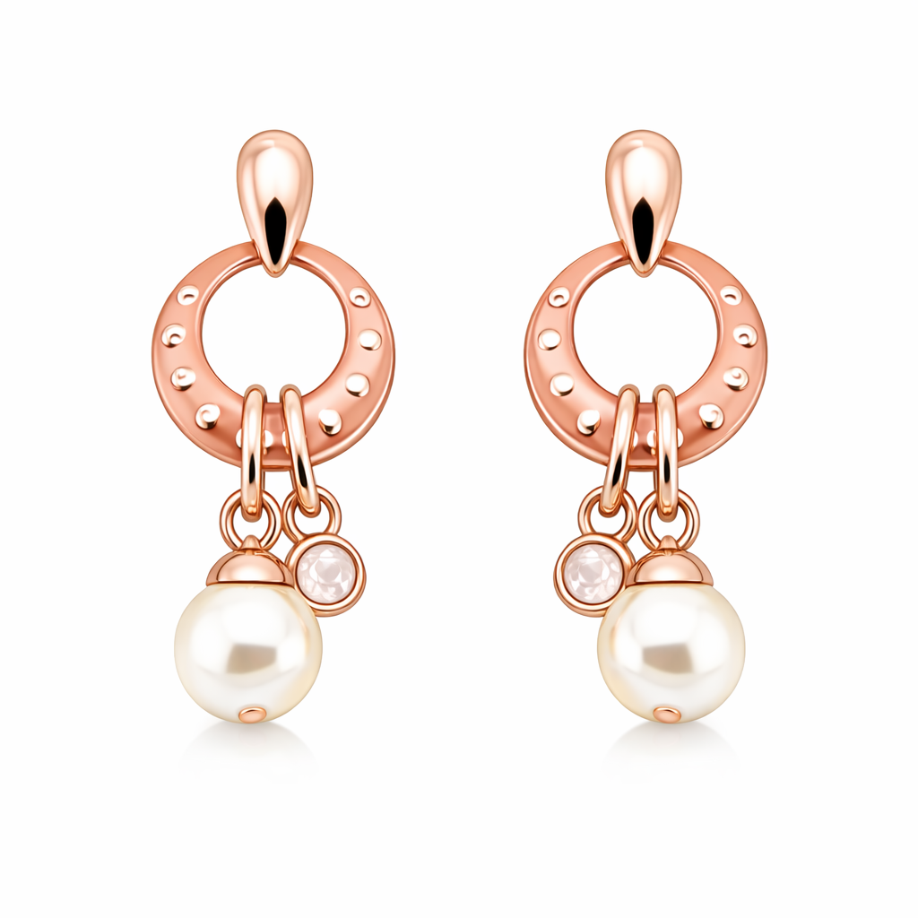 Lindos aretes en baño de oro rosa de 18 quilates con esmaltado en rosa, perla e incrustaciones de cristales blancos. Fabricado en una estructura de aleación de platino con rodio sin níquel.