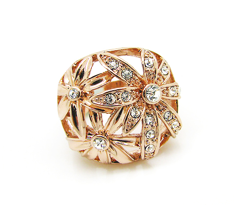 Elegante anillo, en baño de oro rosa de 18 quilates, con diseño de flores caladas, detalles en relieve e incrustaciones de cristales blancos. Fabricado en una estructura de aleación de platino con rodio sin níquel.